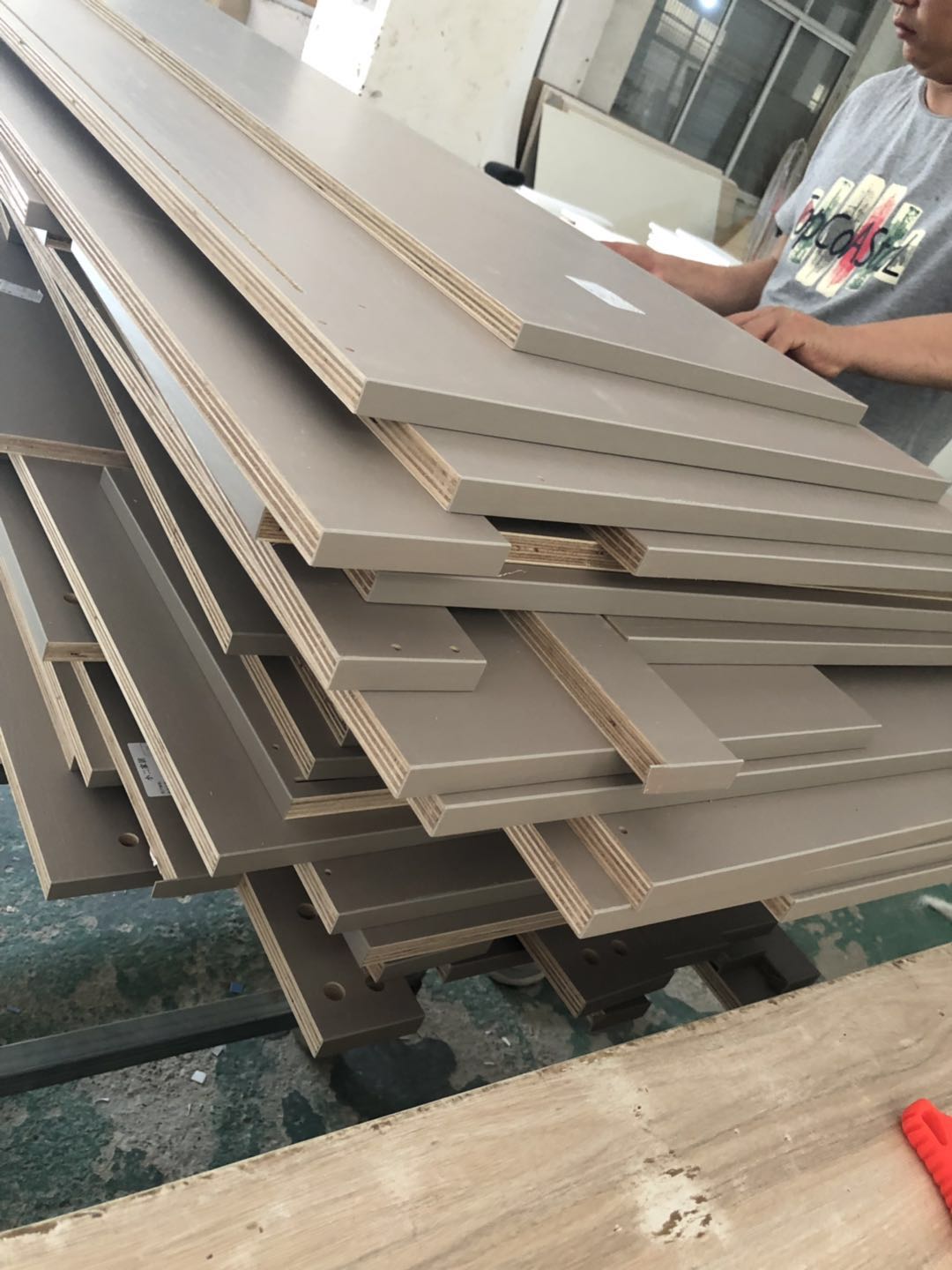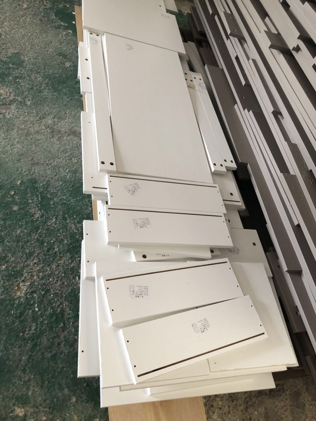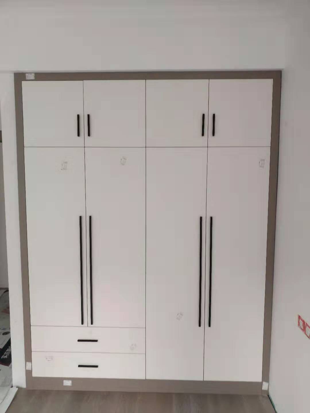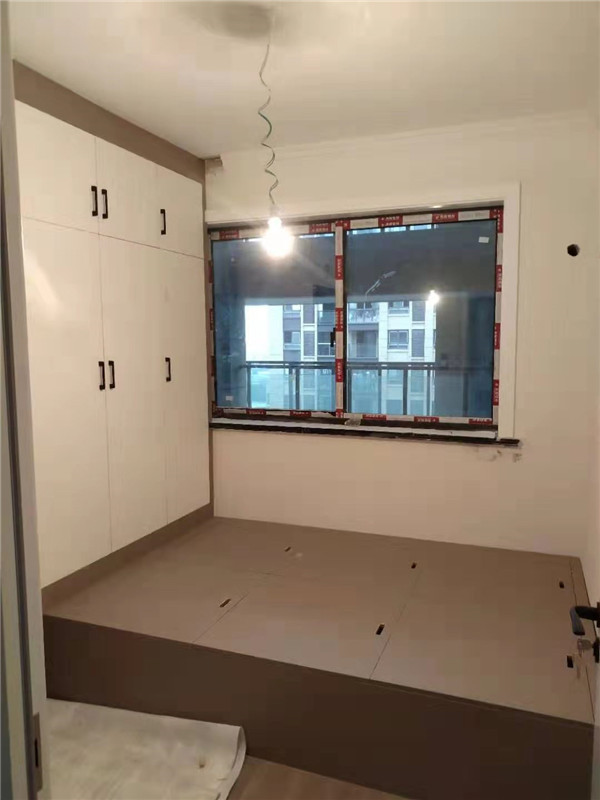 衣柜開板了,板材使用平安樹實木多層進口暖白制作,真材實料,有高級的藍光防偽標識,圖4-6是榻榻米鞋柜書桌等柜體板,板材使用金蘋果時尚灰制作。