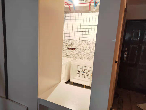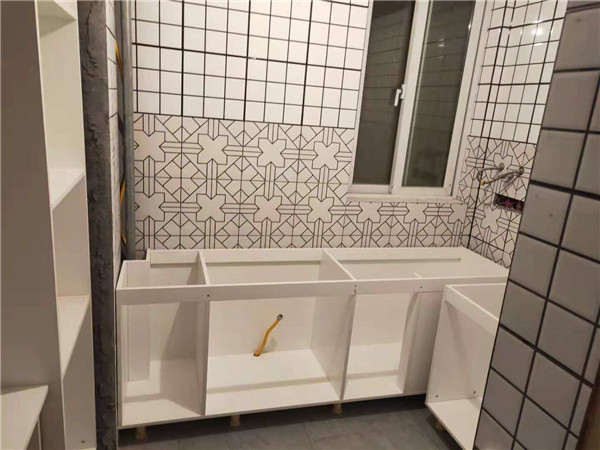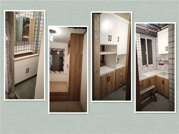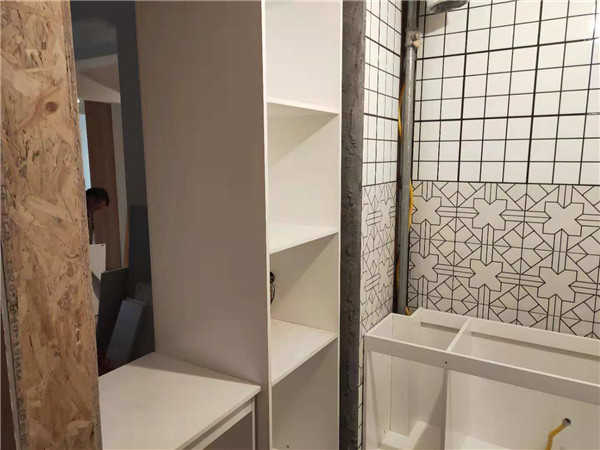 開始制作啦,衣柜榻榻米和廚房的板材封邊中,板材使用平安樹實木多層板制作,封邊條上印有小二家居的logo!