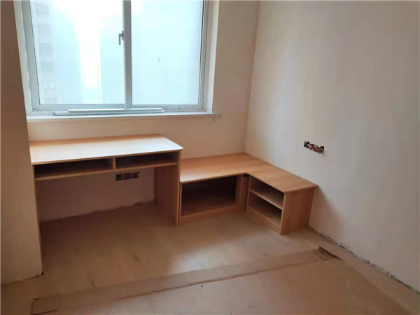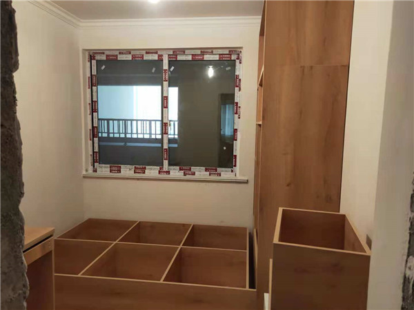 主臥飄窗柜的板材打孔中,櫥柜板材已經封邊好了,待打孔,板面暖白色封邊條黃色的板材是門板板材,也是打孔中。