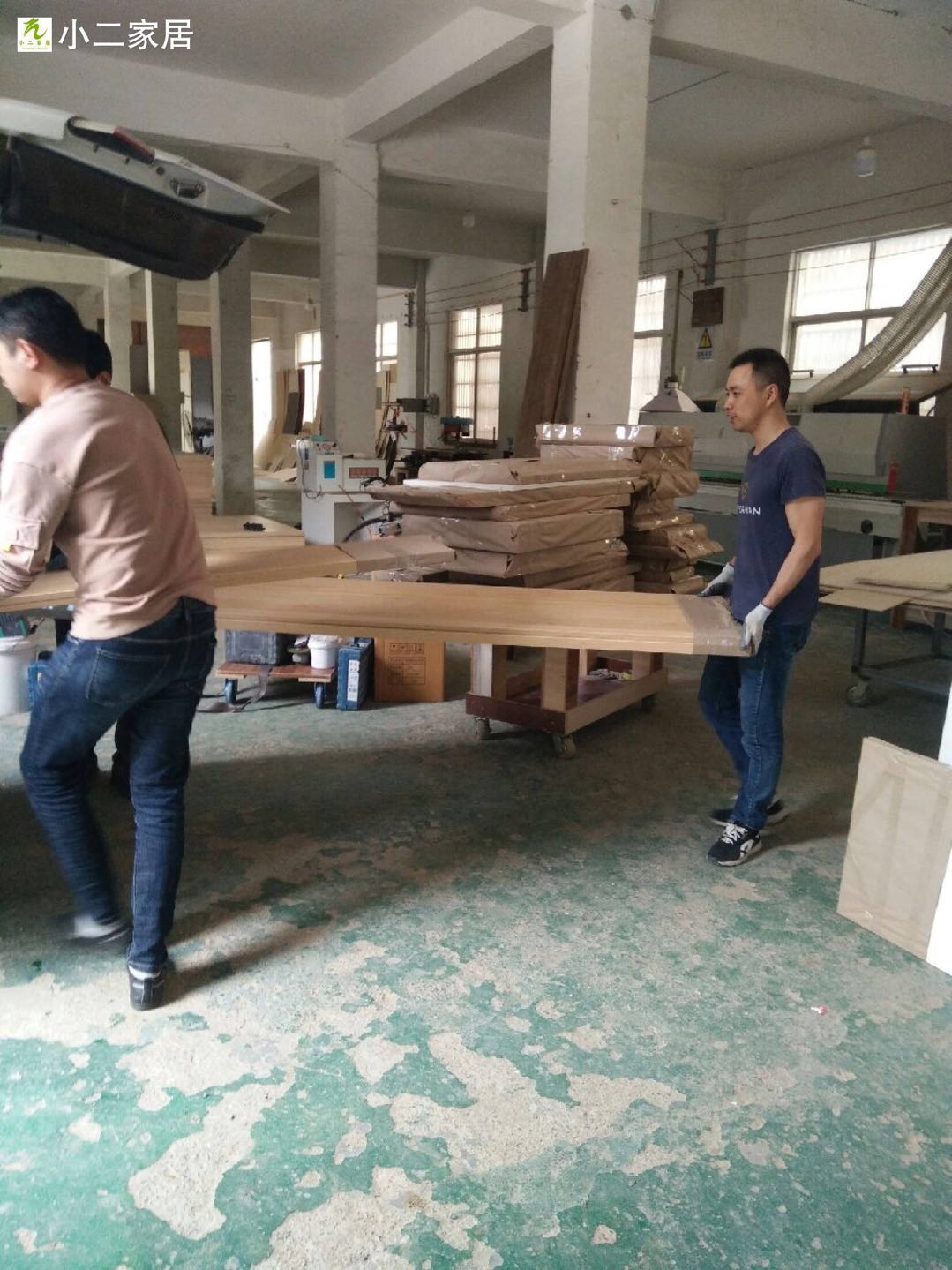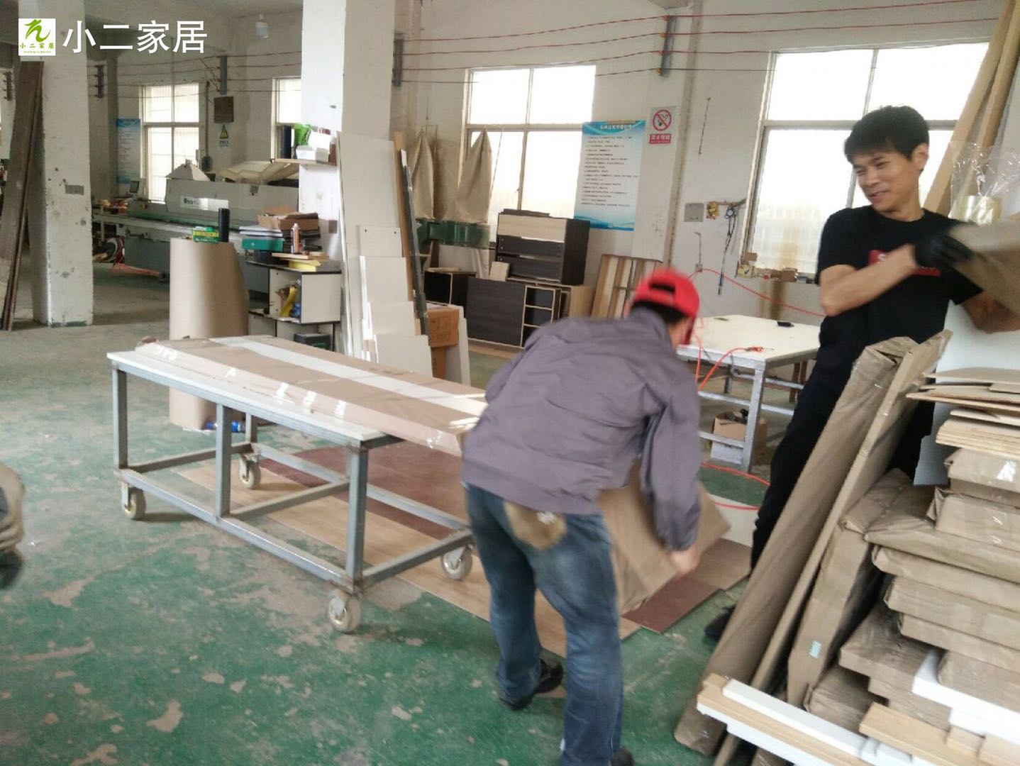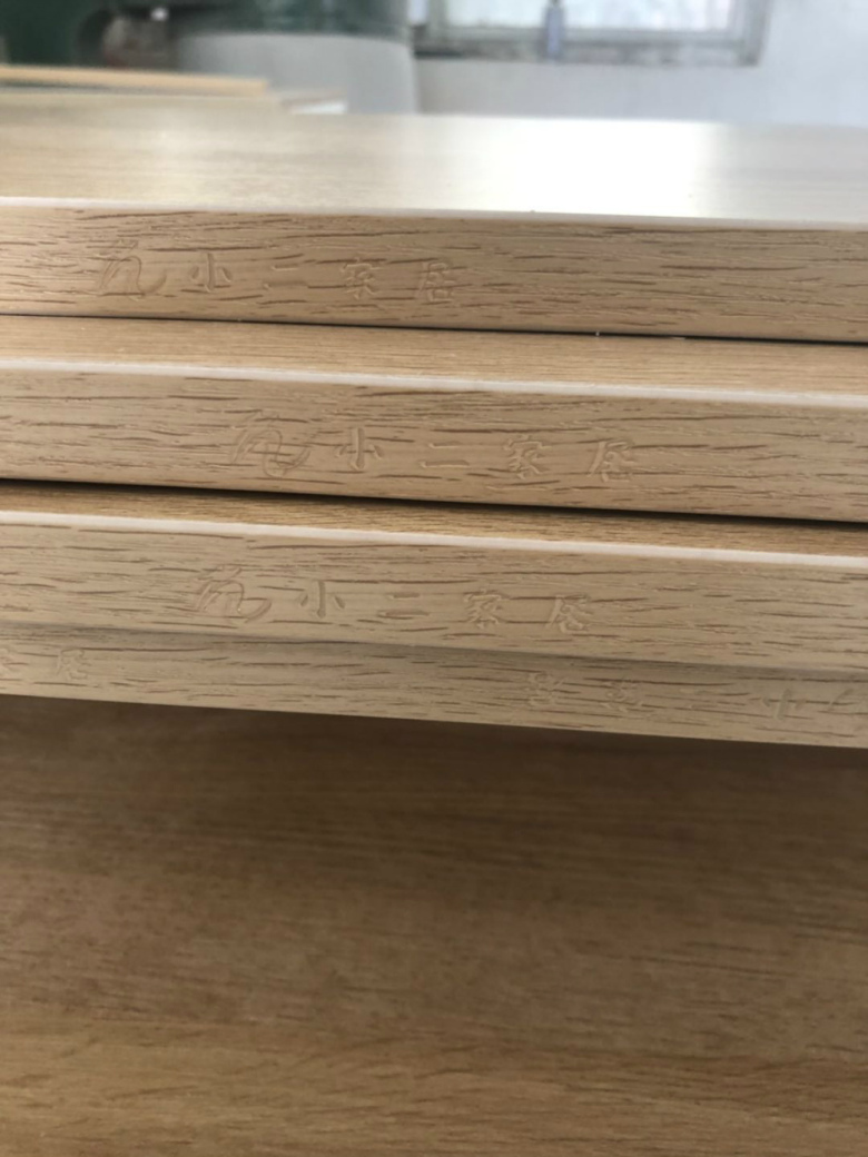 接下來開始封邊,板材使用平安樹E0級,封邊使用的法國波士熱熔膠,封邊機器溫度高達200°C,封邊條上有小二家居的logo哦