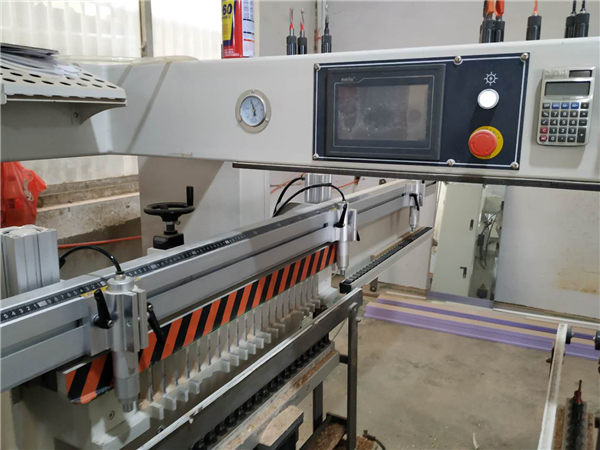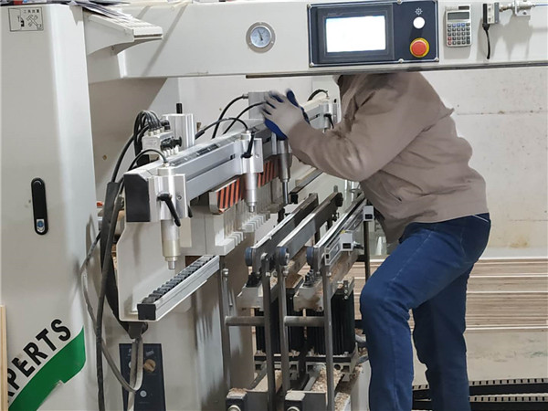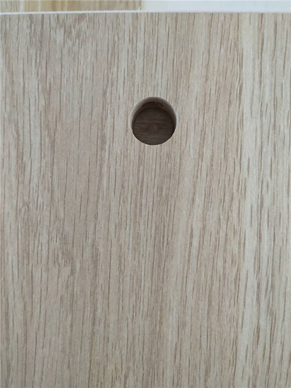 鞋柜板制作中,板材已經裁好板封好邊啦,現在在打孔中,師傅正在調整機器,打出來的孔就是圖5的樣子啦,很圓整,沒有爆邊。