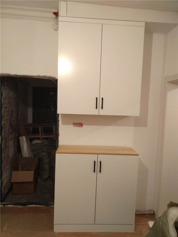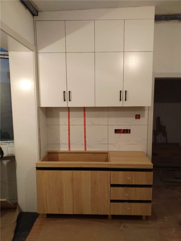 柜子已經裝好啦,還差臺面了,清水橡木色柜體配上暖白色柜門的經典搭配,效果很百搭哦!