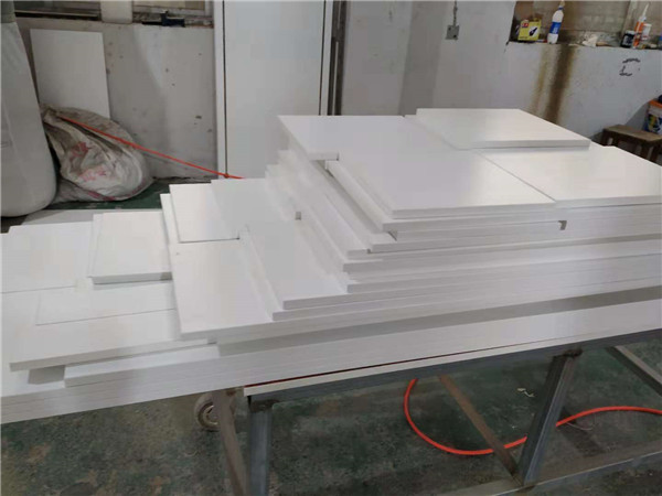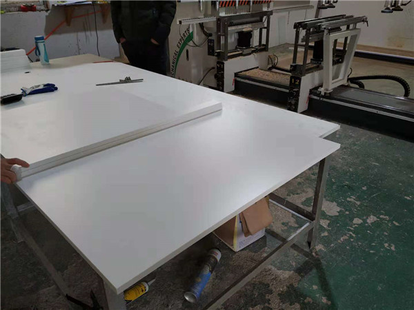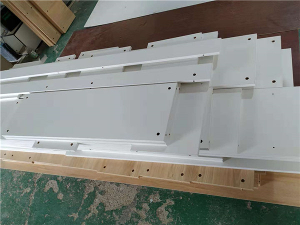 輪子柜和擋板板材打孔中,門板板材封邊中,板材使用平安樹麻面白色實木多層板制作,封邊使用熱熔顆粒膠,用專門的機器封邊。