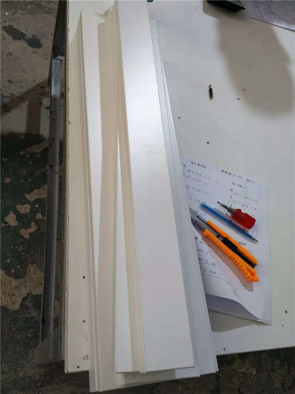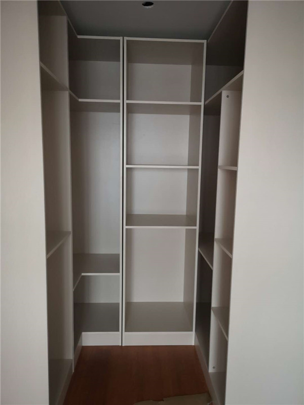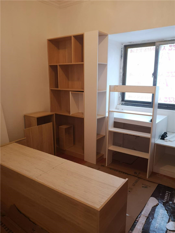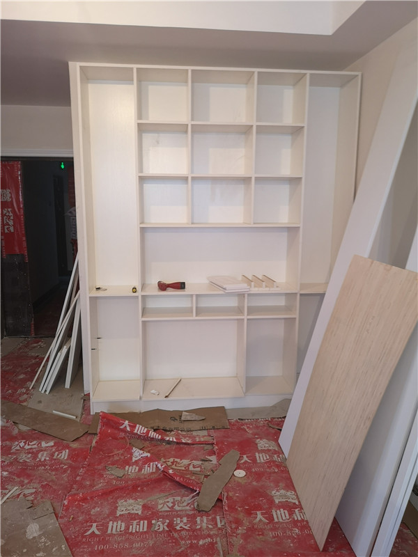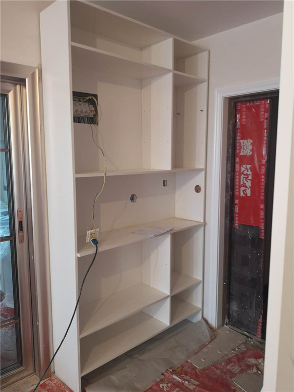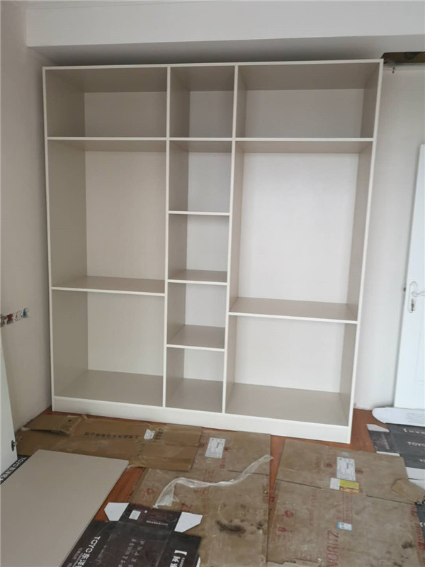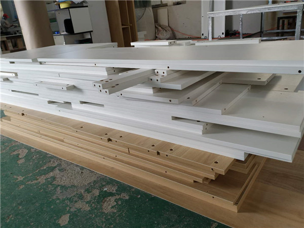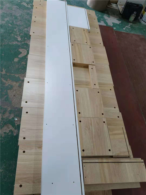 圖1清水橡木色的板材是兒童房衣柜,麻面白的是酒柜板材,已經打好孔啦,門板板材是平安樹麻面白色,柜體板是清水橡木色。