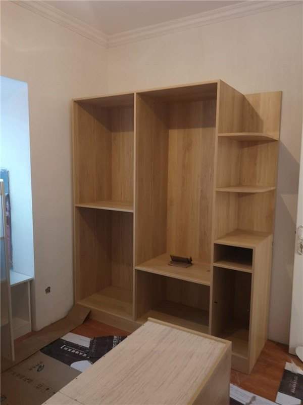 圖3圖4是兒童房衣柜板打孔中,板材使用平安樹清水橡木色實木多層板制作。