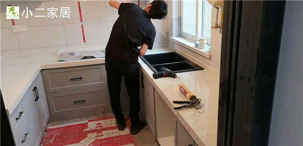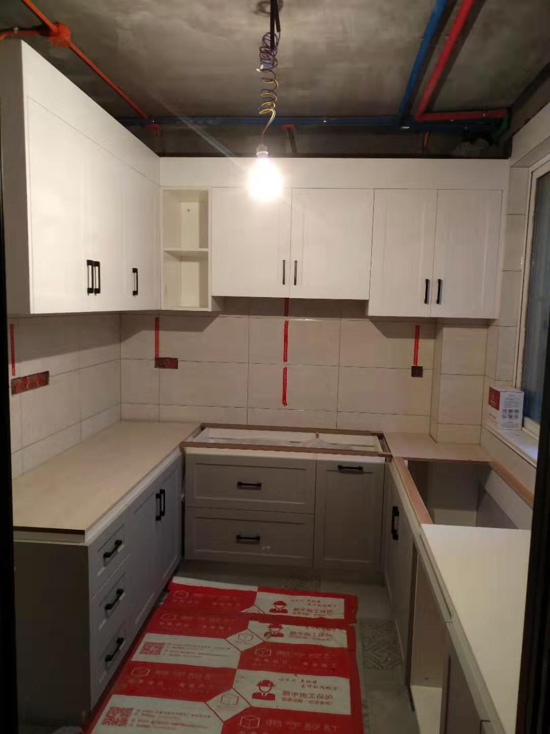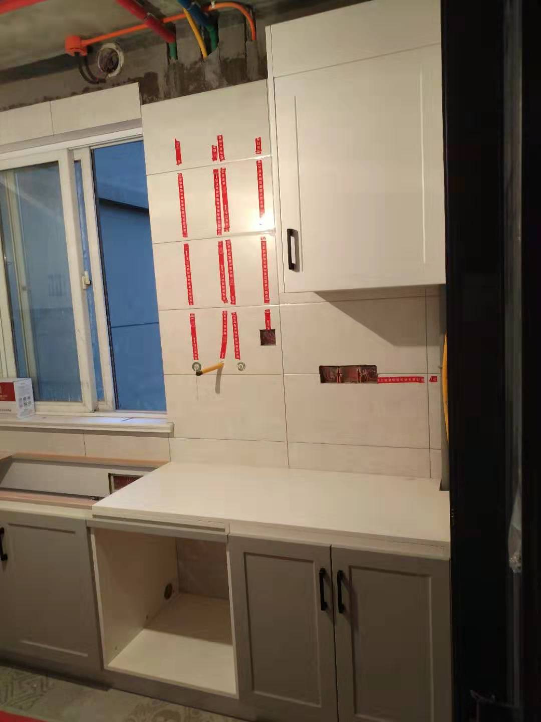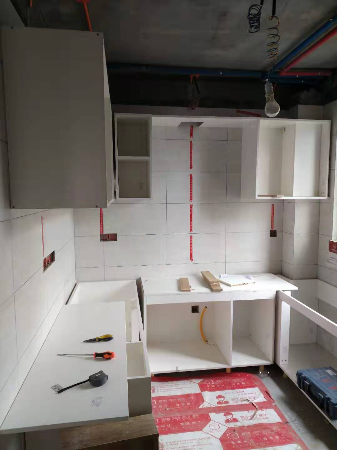 安裝進行中,五金標(biāo)配:pvc雙層踢腳線、ABS尼龍柜腳、和居拉手,海蒂詩導(dǎo)軌、諾米鉸鏈。不得不說師傅挺給力的,大半天時間柜體裝的差不多了,點贊
