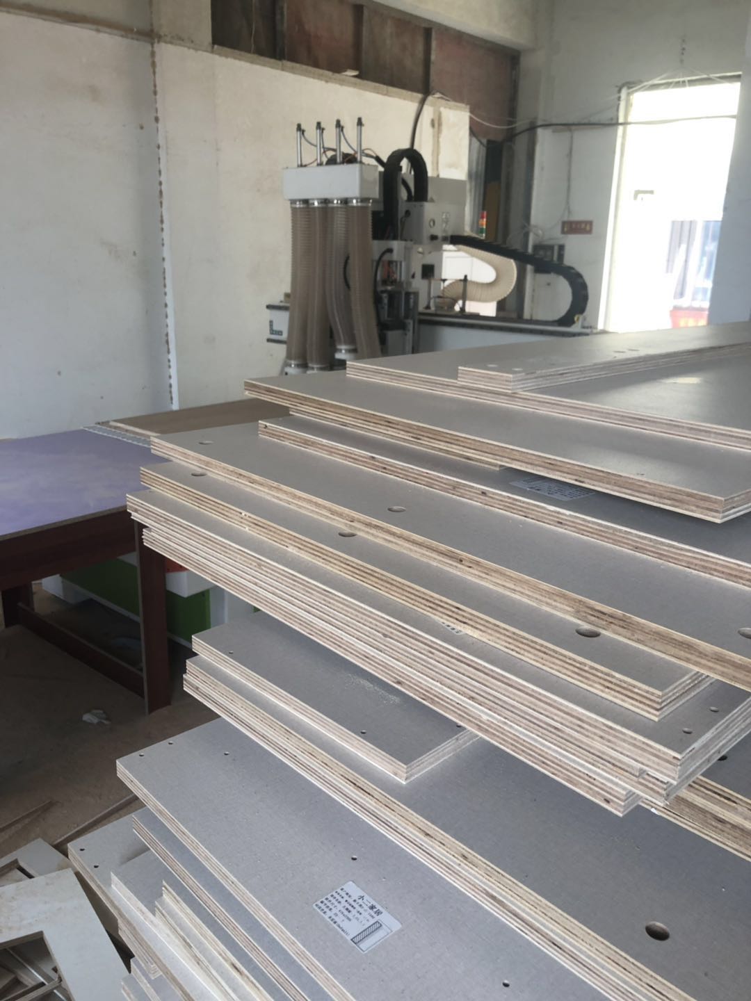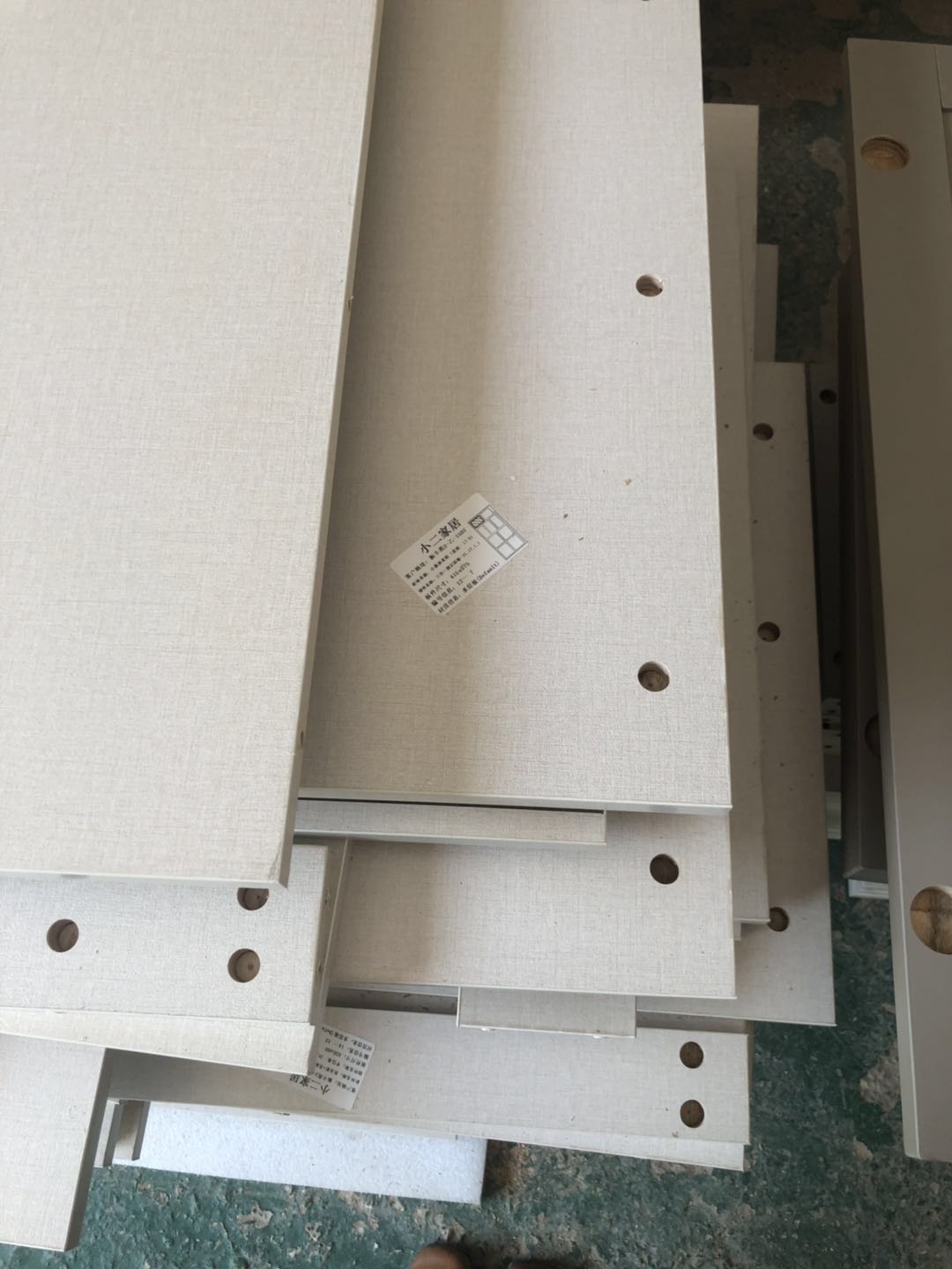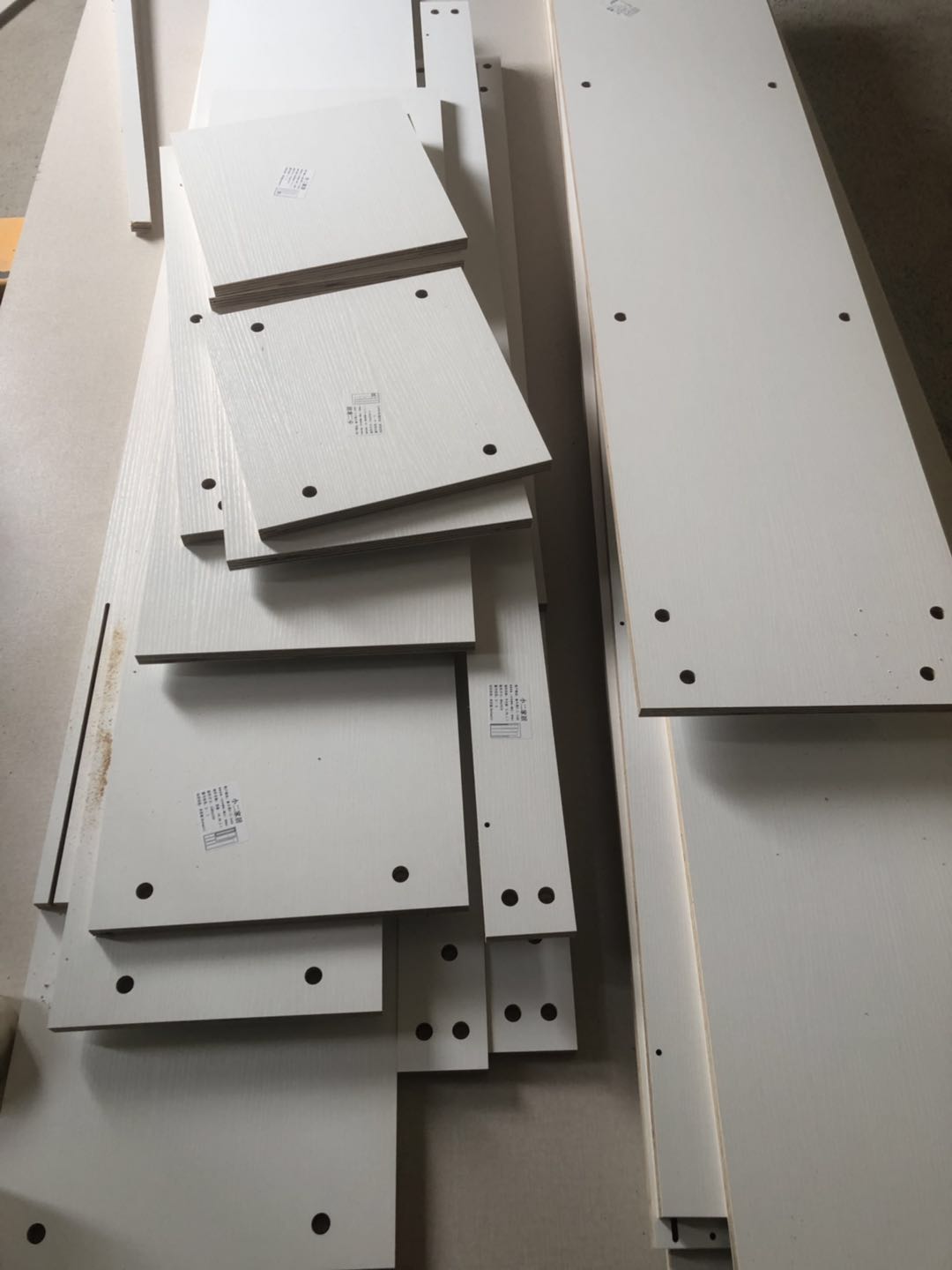開(kāi)始制作啦,裁板打孔中,圖1是陽(yáng)臺(tái)吊柜,板材使用平安樹(shù)暖白色實(shí)木多層制作,有高級(jí)的藍(lán)光防偽標(biāo)識(shí)哦,圖4-6是衣柜的柜體板,板材使用平安樹(shù)皮紋-1實(shí)木多層制作,裁出來(lái)的板沒(méi)有爆邊~