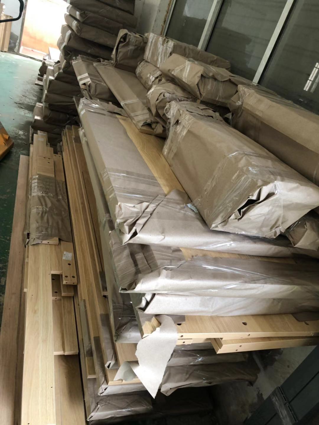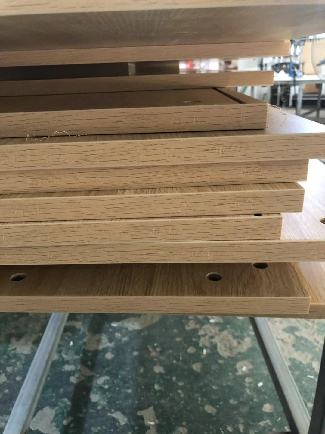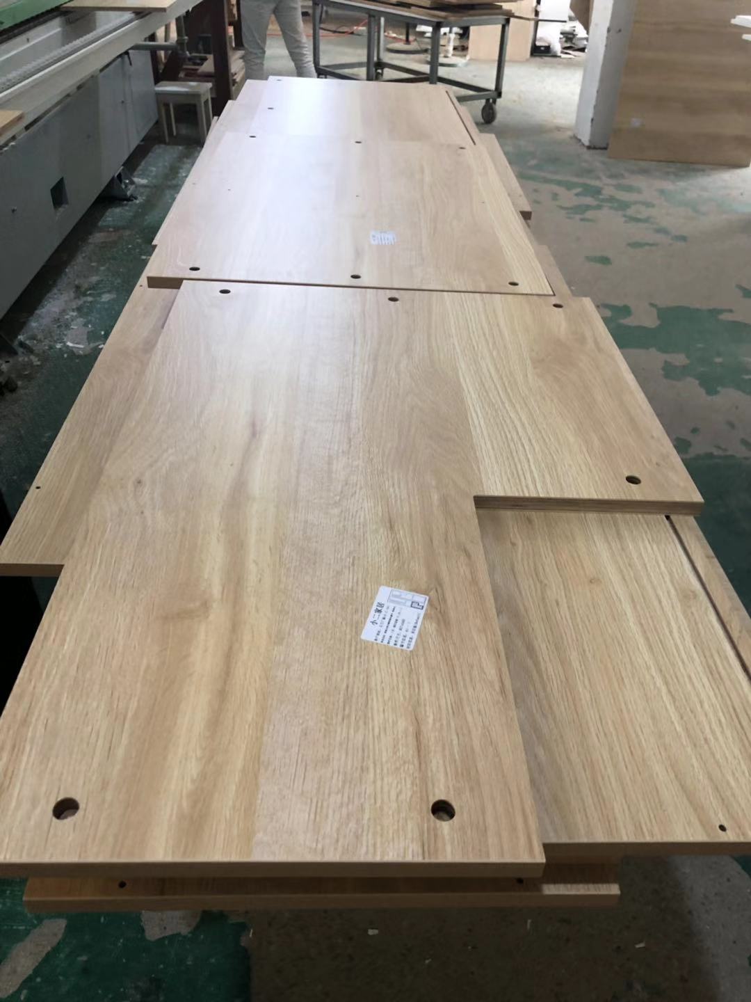 所有的柜體板已經裁完了,板材使用平安樹實木多層E清水橡木E0級制作,真材實料,有高級的藍光防偽標識,正在封邊中,封邊條上有小二家居的Logo,師傅們蠻給力的加班加點的趕生產,希望早日送到客戶家里去。