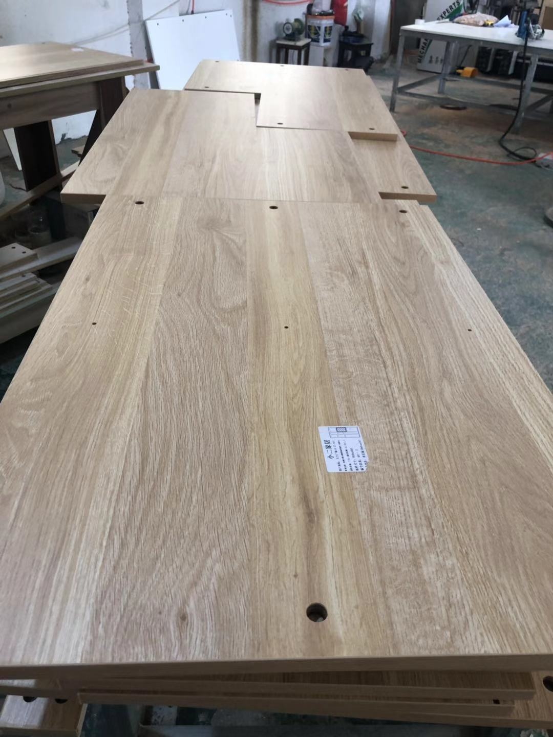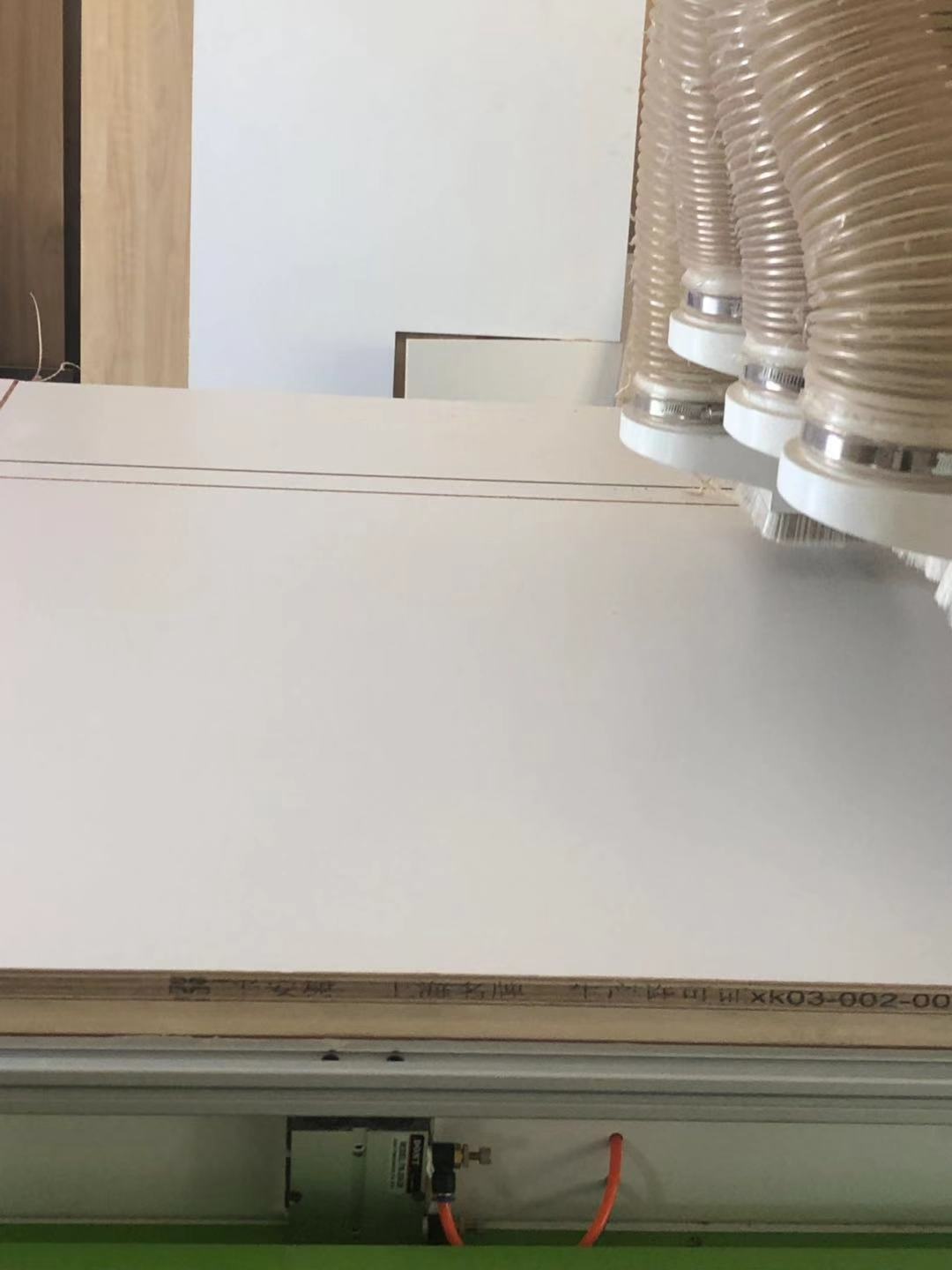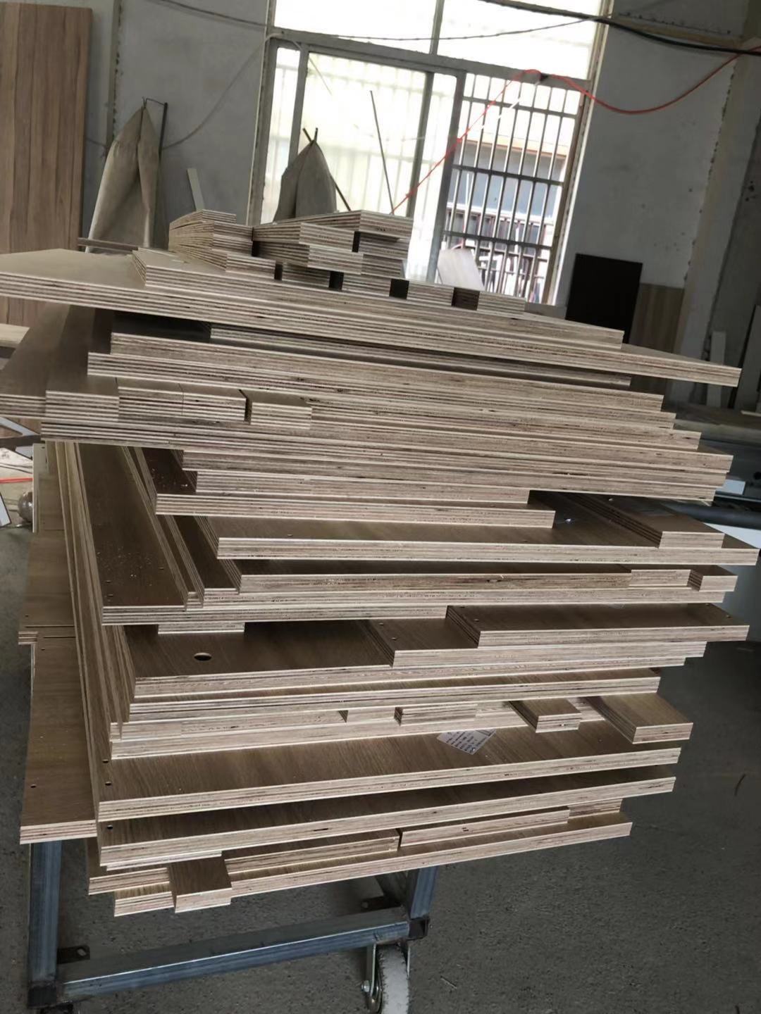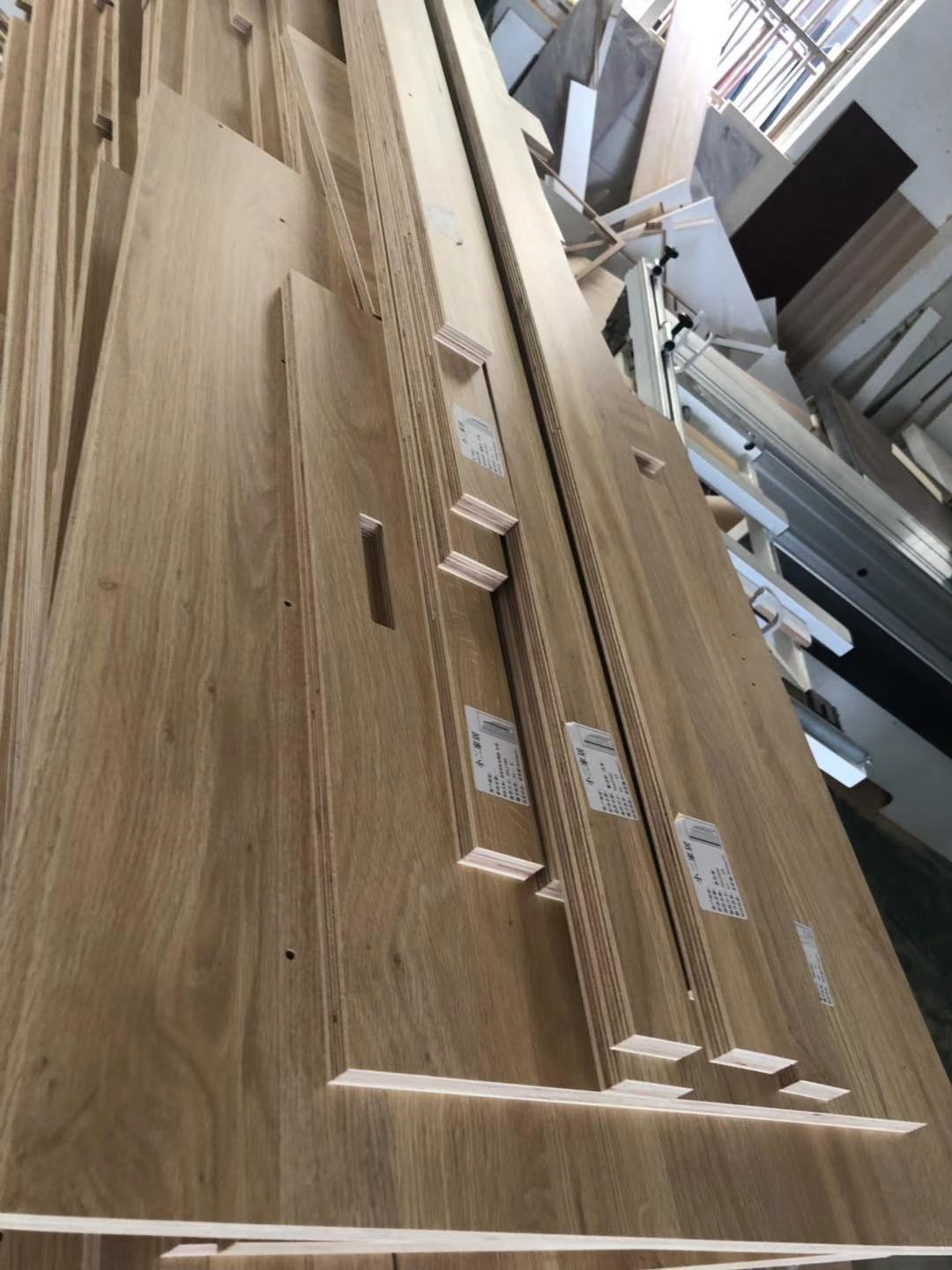 門板制作中,板材使用平安樹實木多層麻面暖白E0級制做,專業設備裁出來的板沒有爆邊!