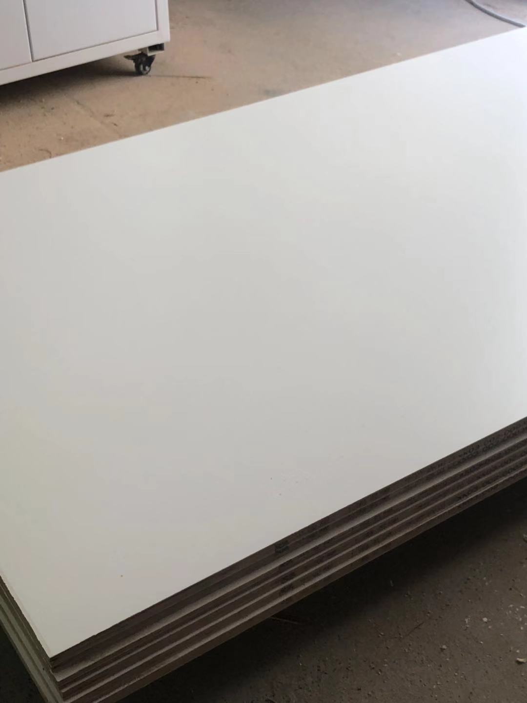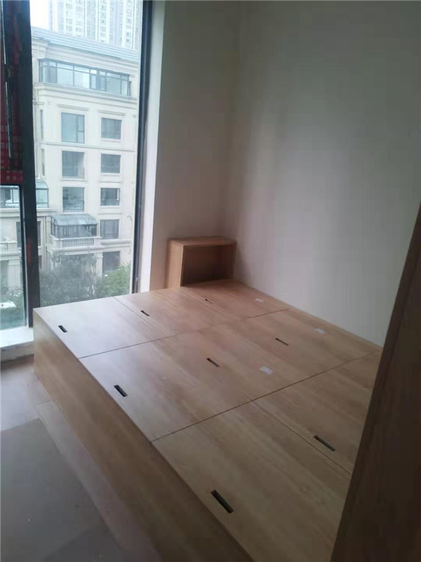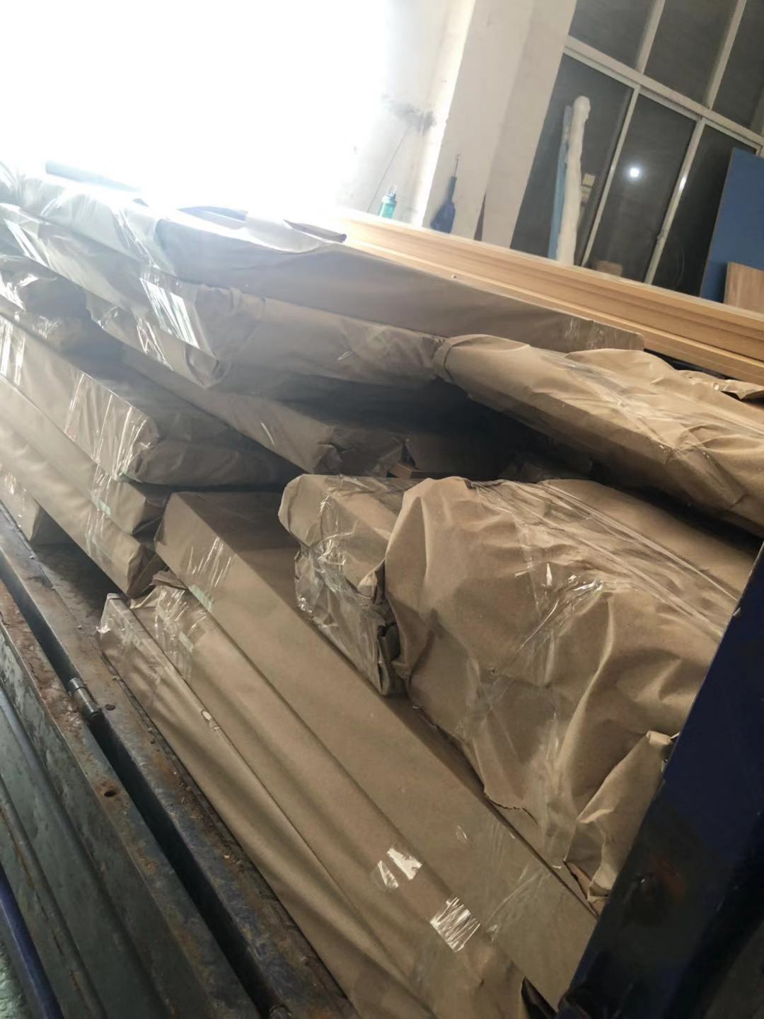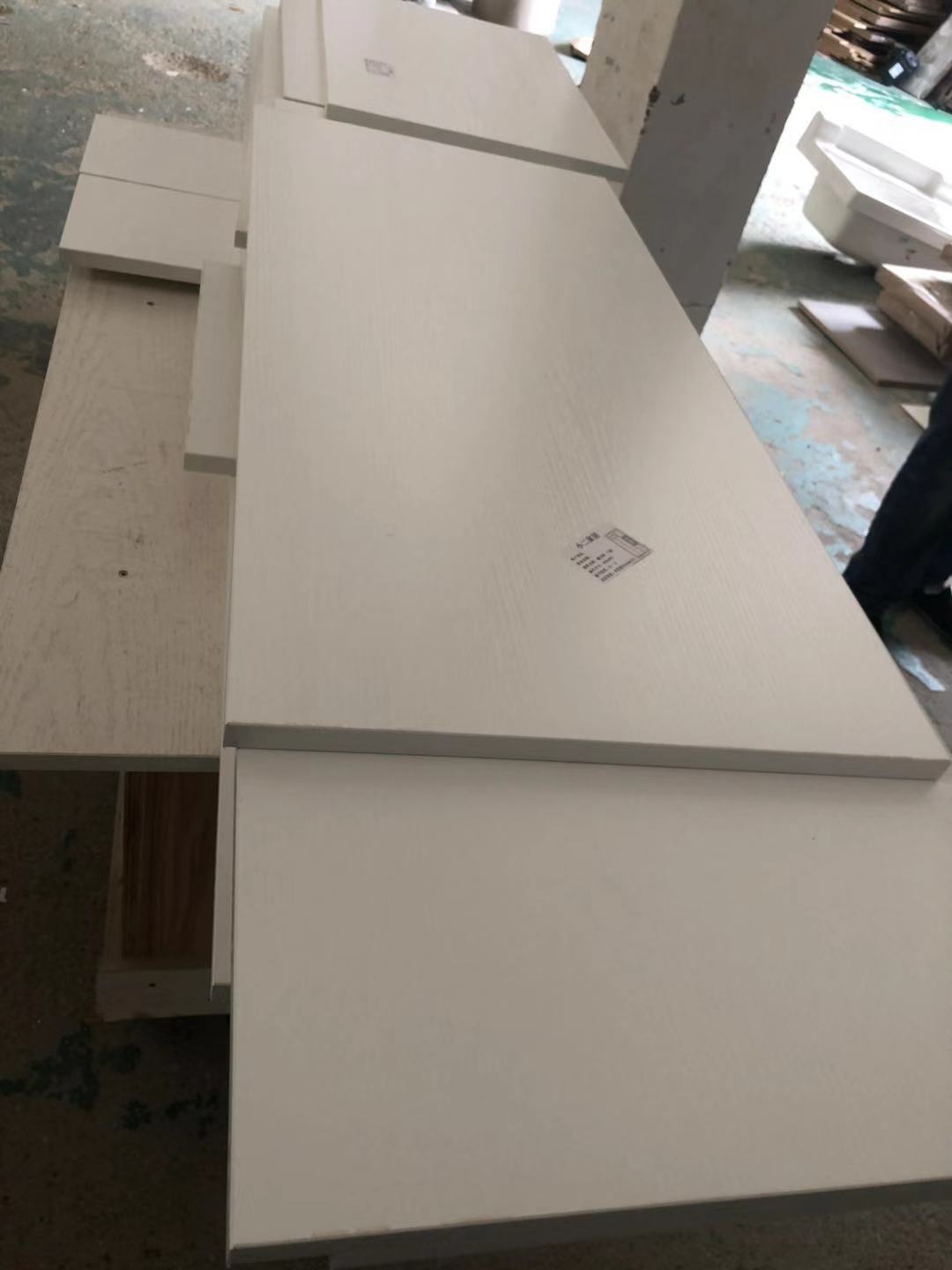 門板制作中,板材使用平安樹實木多層麻面暖白E0級制做,專業設備裁出來的板沒有爆邊!