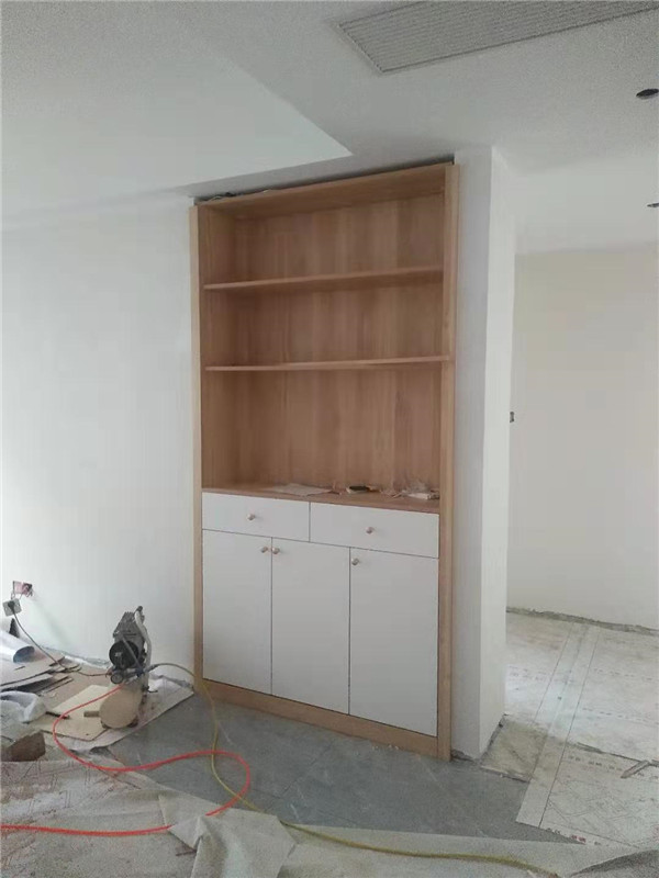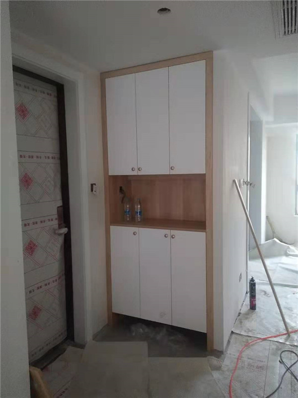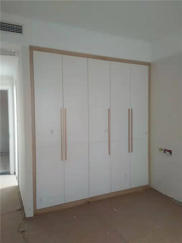 其他柜子采用的是平安樹實木多層板,一般客戶原木色配白色都會相應的搭配黑色拉手,而這個小姐姐眼光比較好,