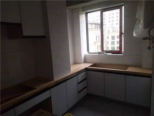 師傅們偷懶了,沒給我拍細節圖 ,直接上安裝好的成品照了,簡單粗暴,請看圖。櫥柜采用的是晶鋼門板,