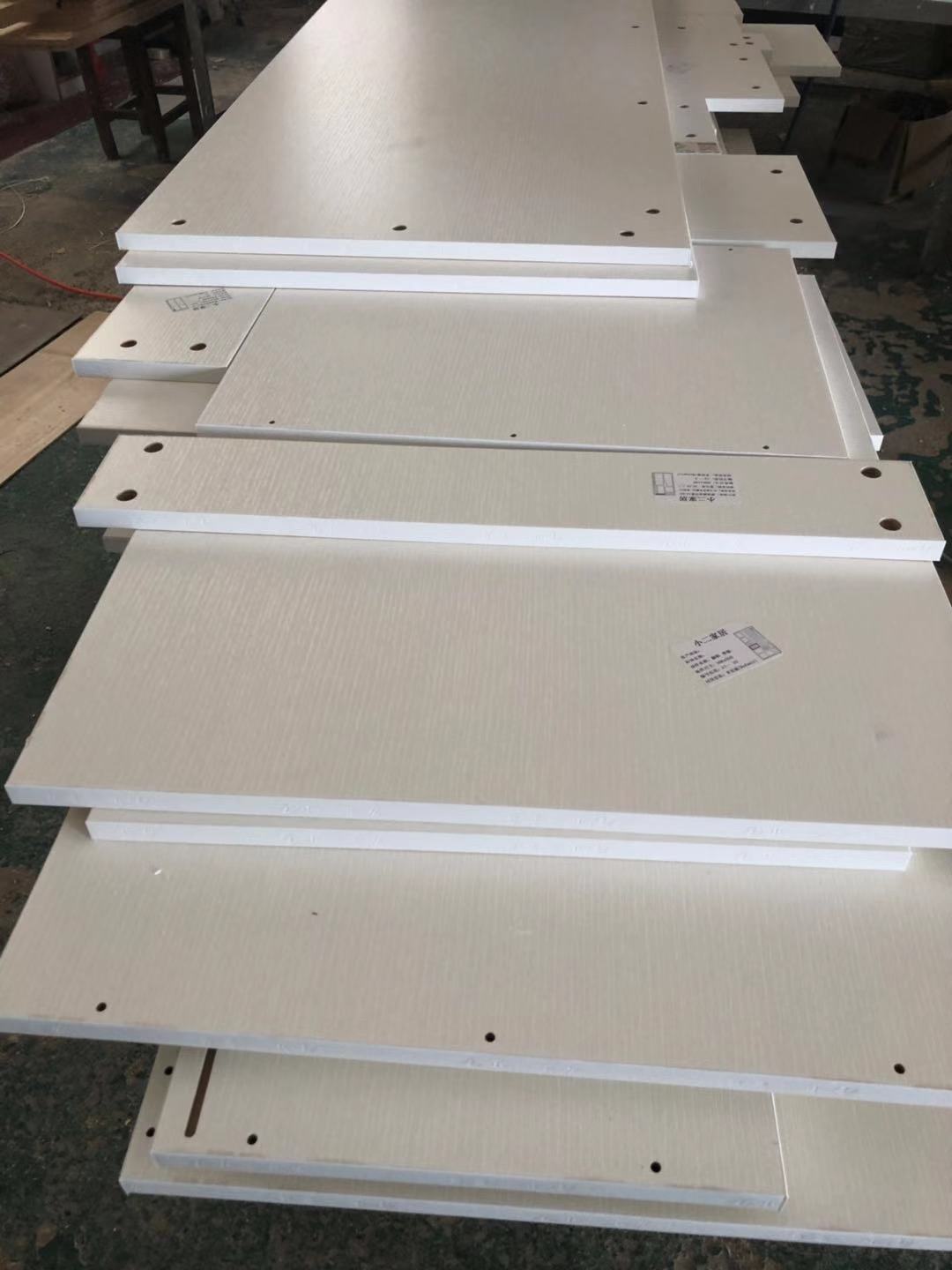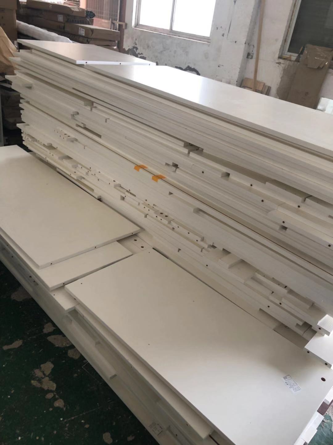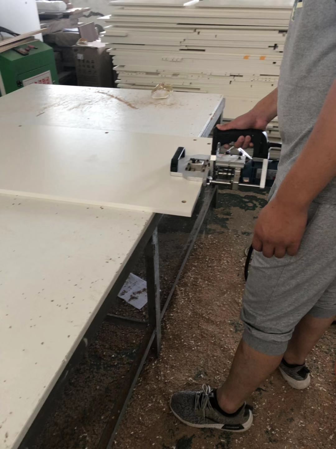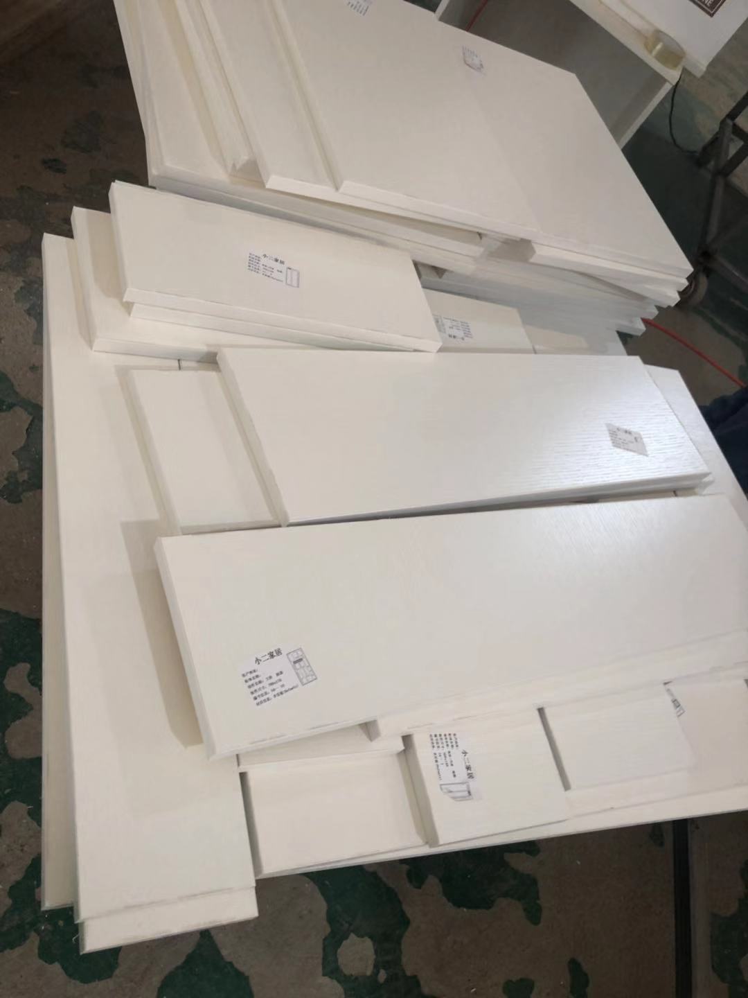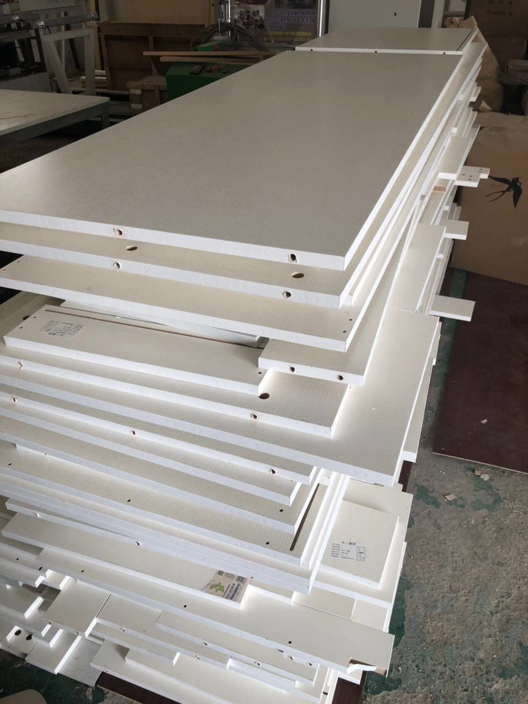 所有的柜體門板都封完邊了,師傅還在打側邊孔,打完就可以打包了。