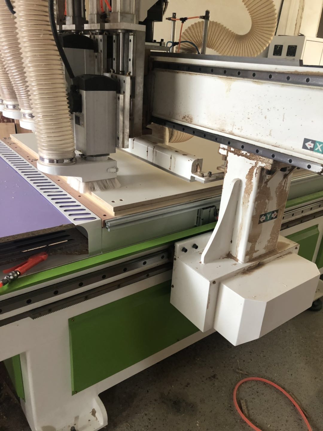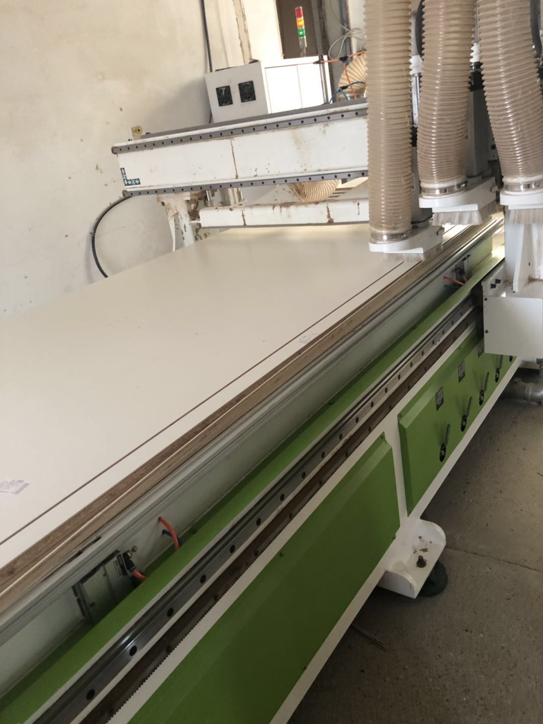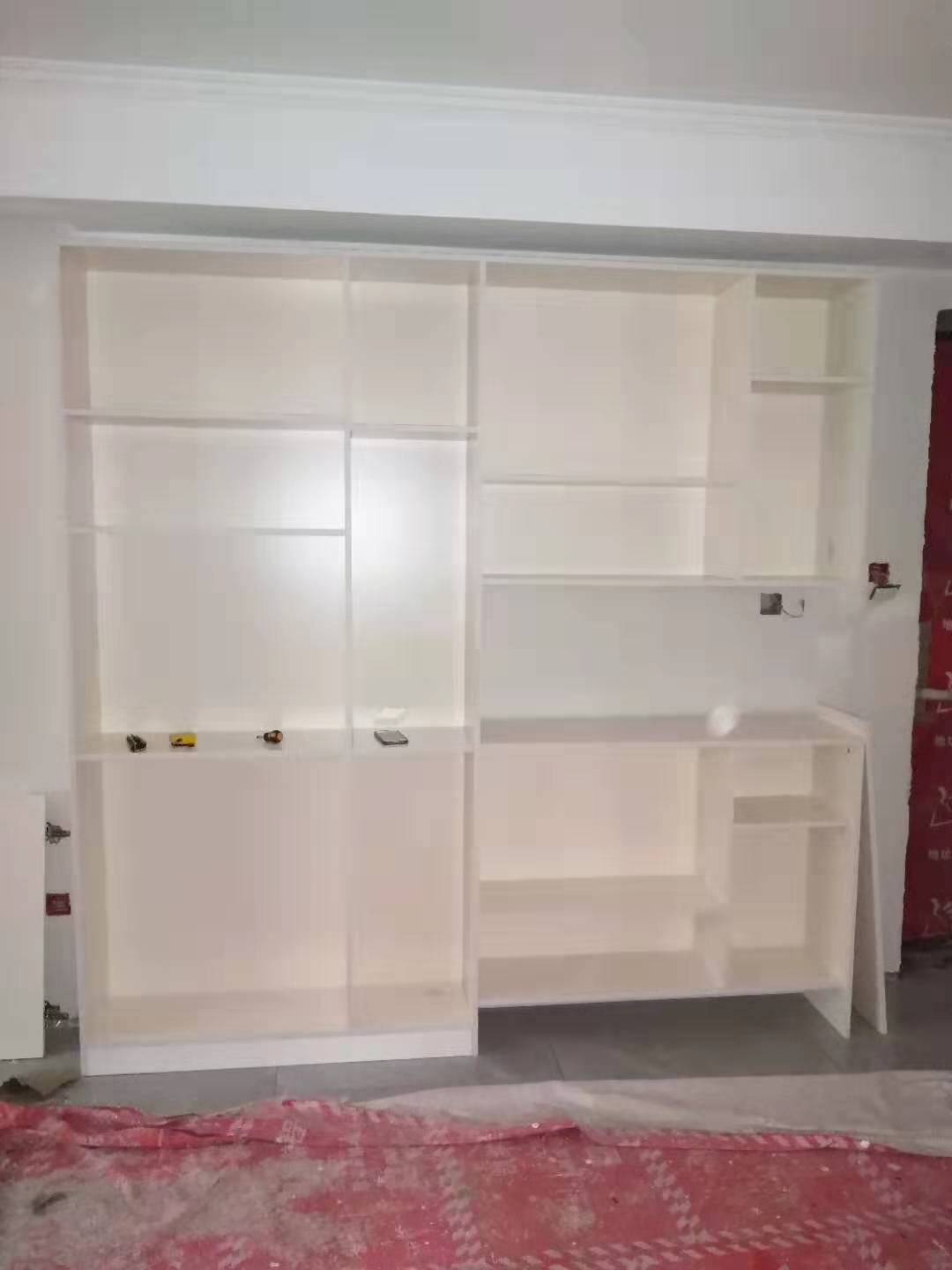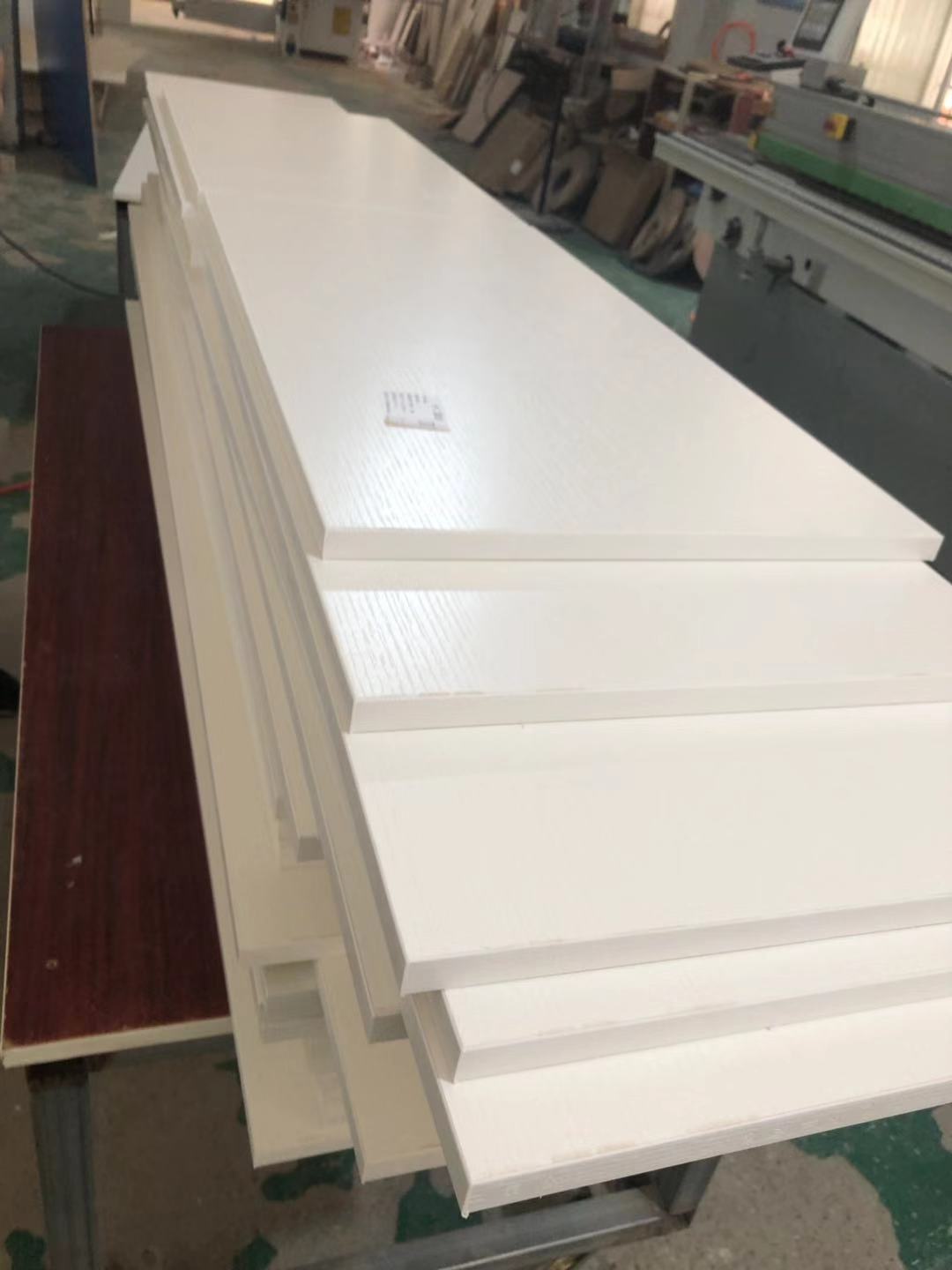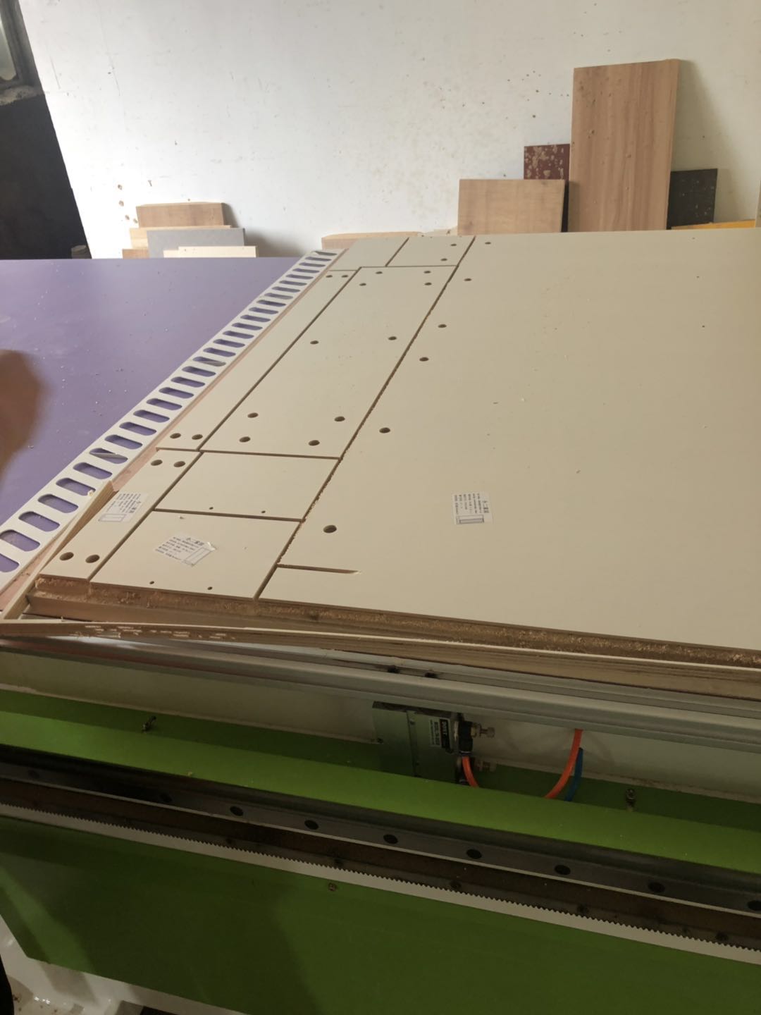 所有的柜體門板都封完邊了,師傅還在打側邊孔,打完就可以打包了。