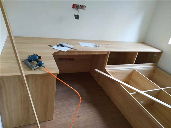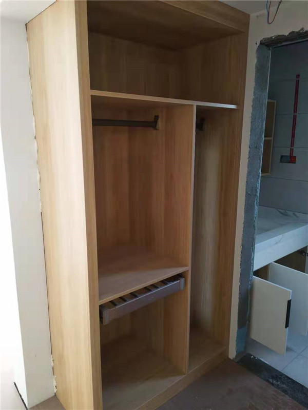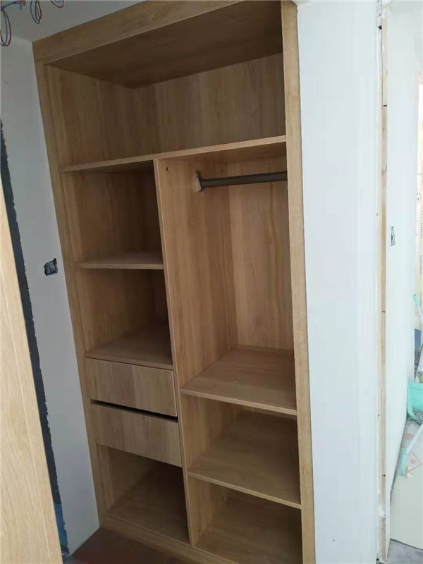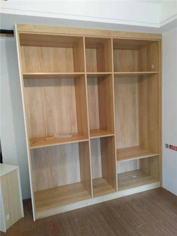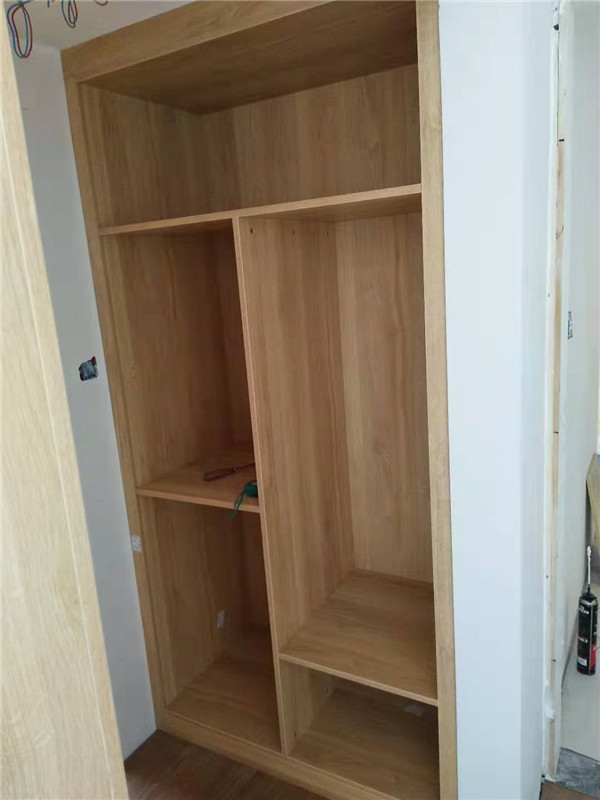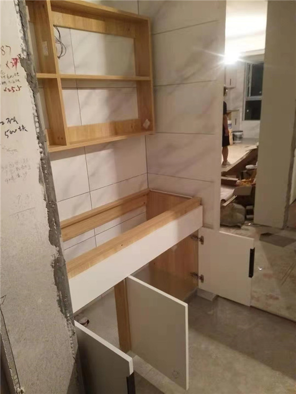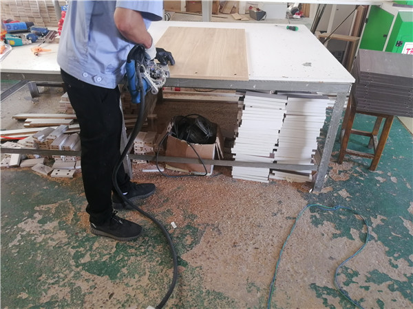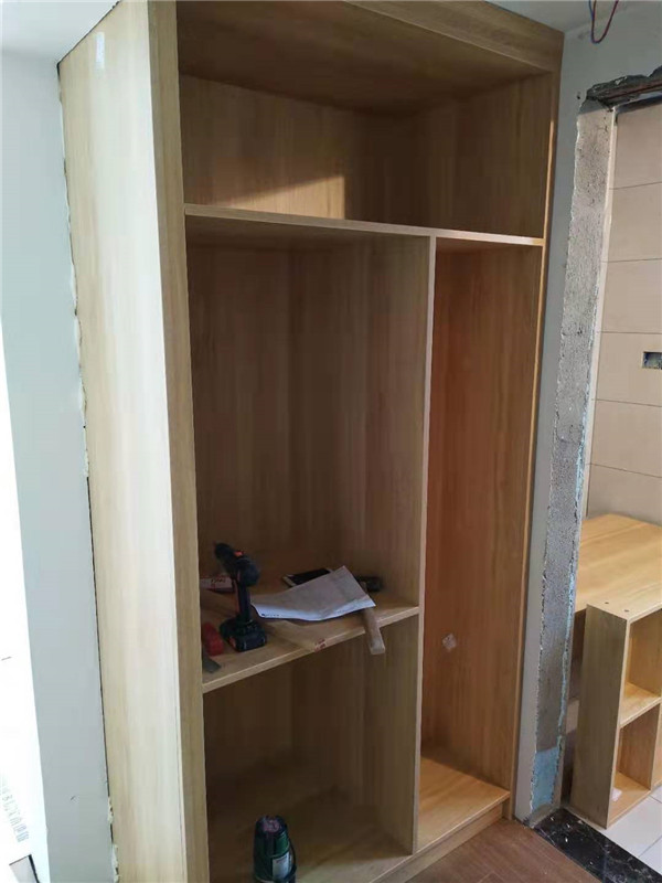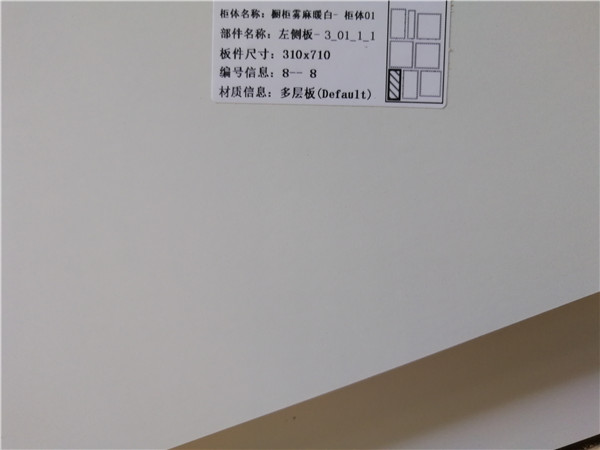 開始制作啦,專業(yè)設備裁板,沒有爆邊。櫥柜、衣柜分別使用平安樹霧麻暖白、清水橡木實木多層板E0級制作,帶有高級的藍光防偽標識,更安心!