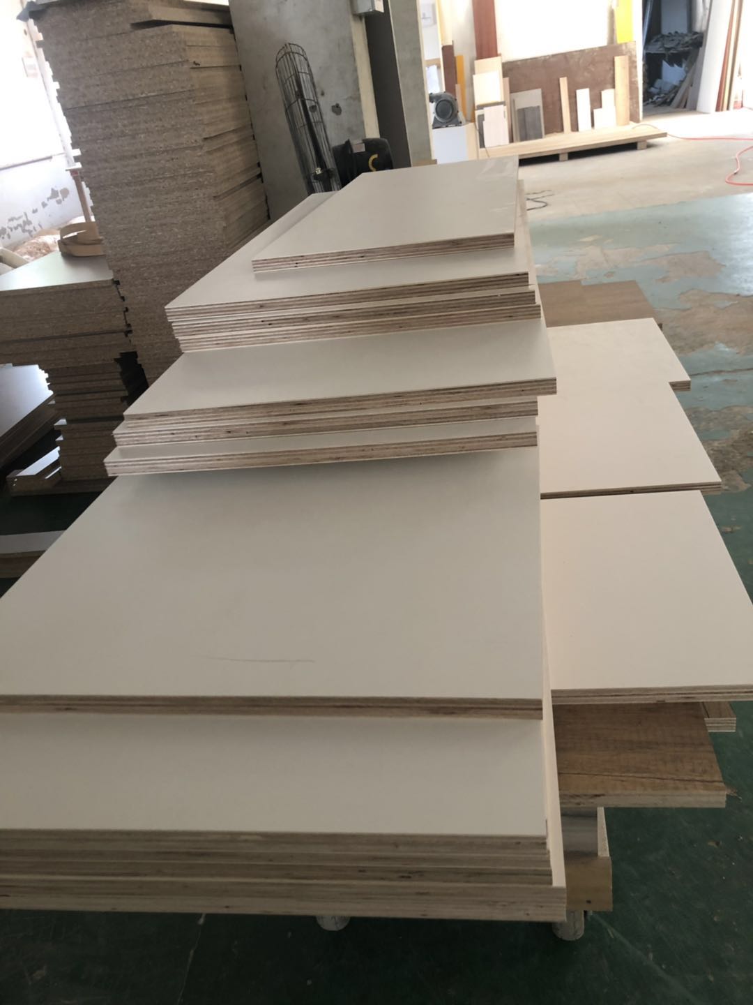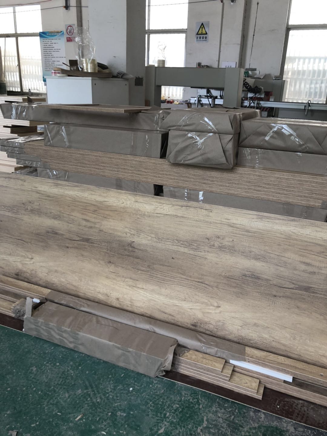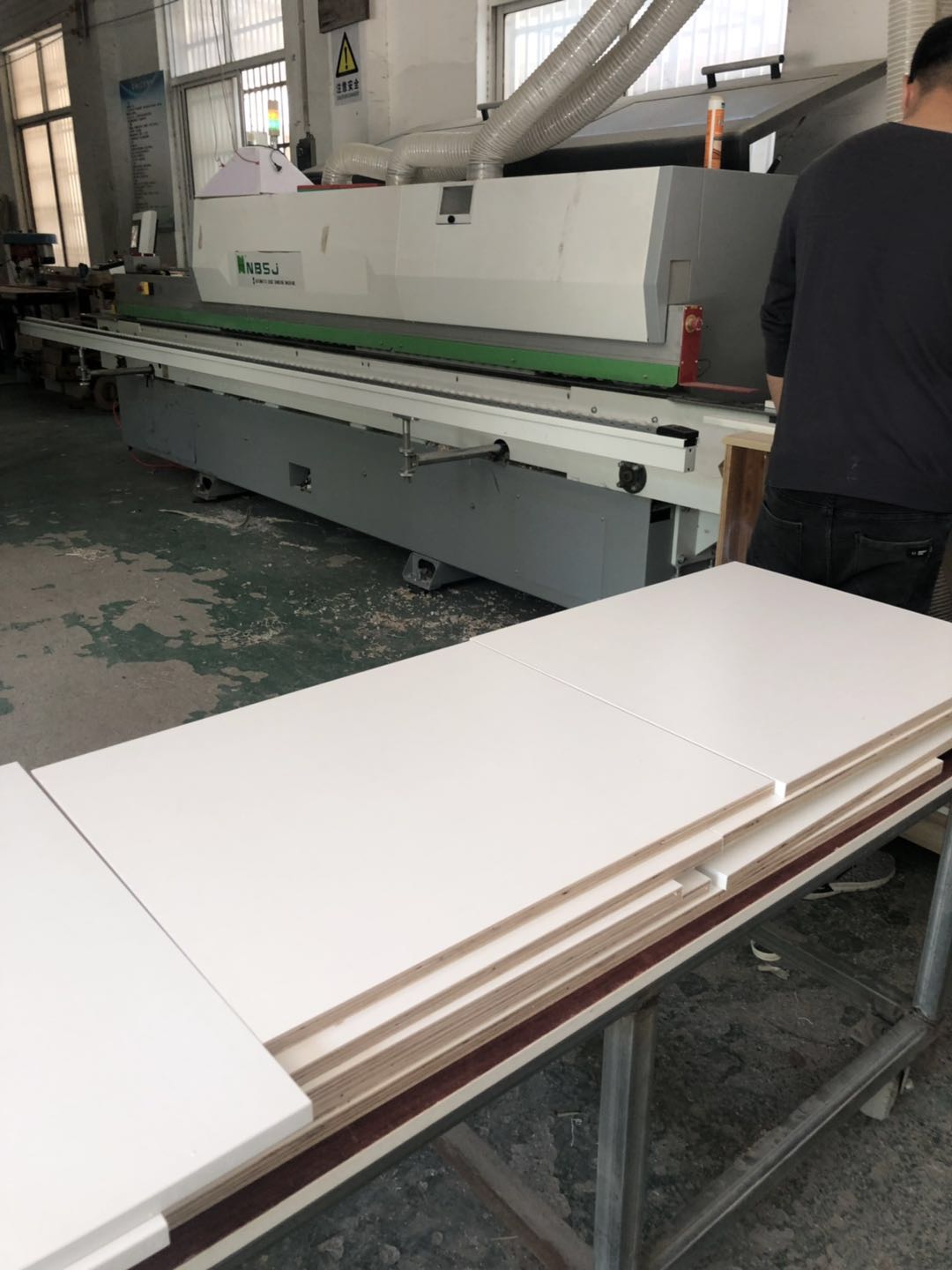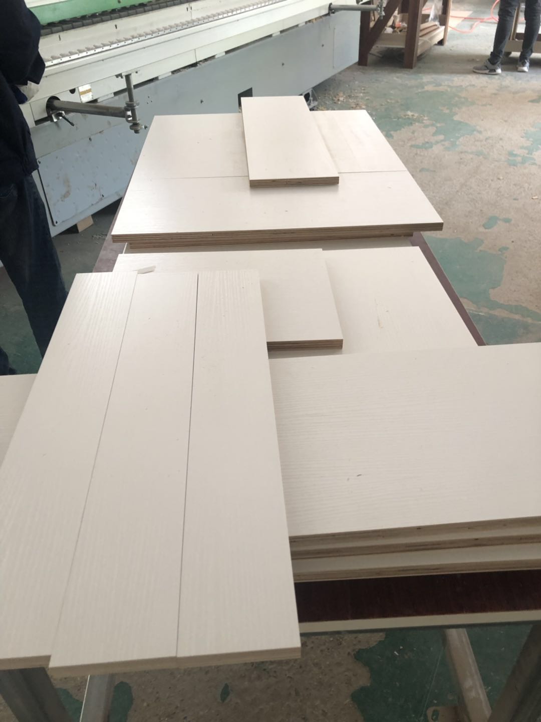 開始制作啦,櫥柜,浴柜,洗衣柜裁板中,專業的設備,沒有爆邊~板材使用平安樹E0級暖白色制作,有高級的藍光防偽標識。