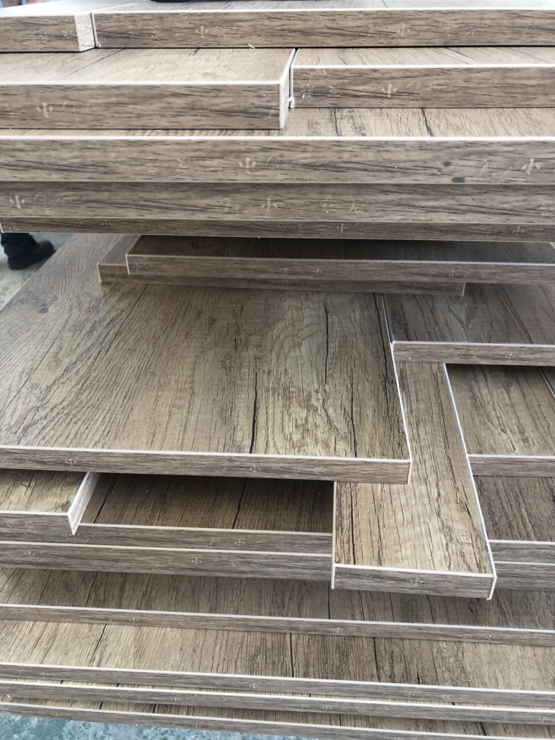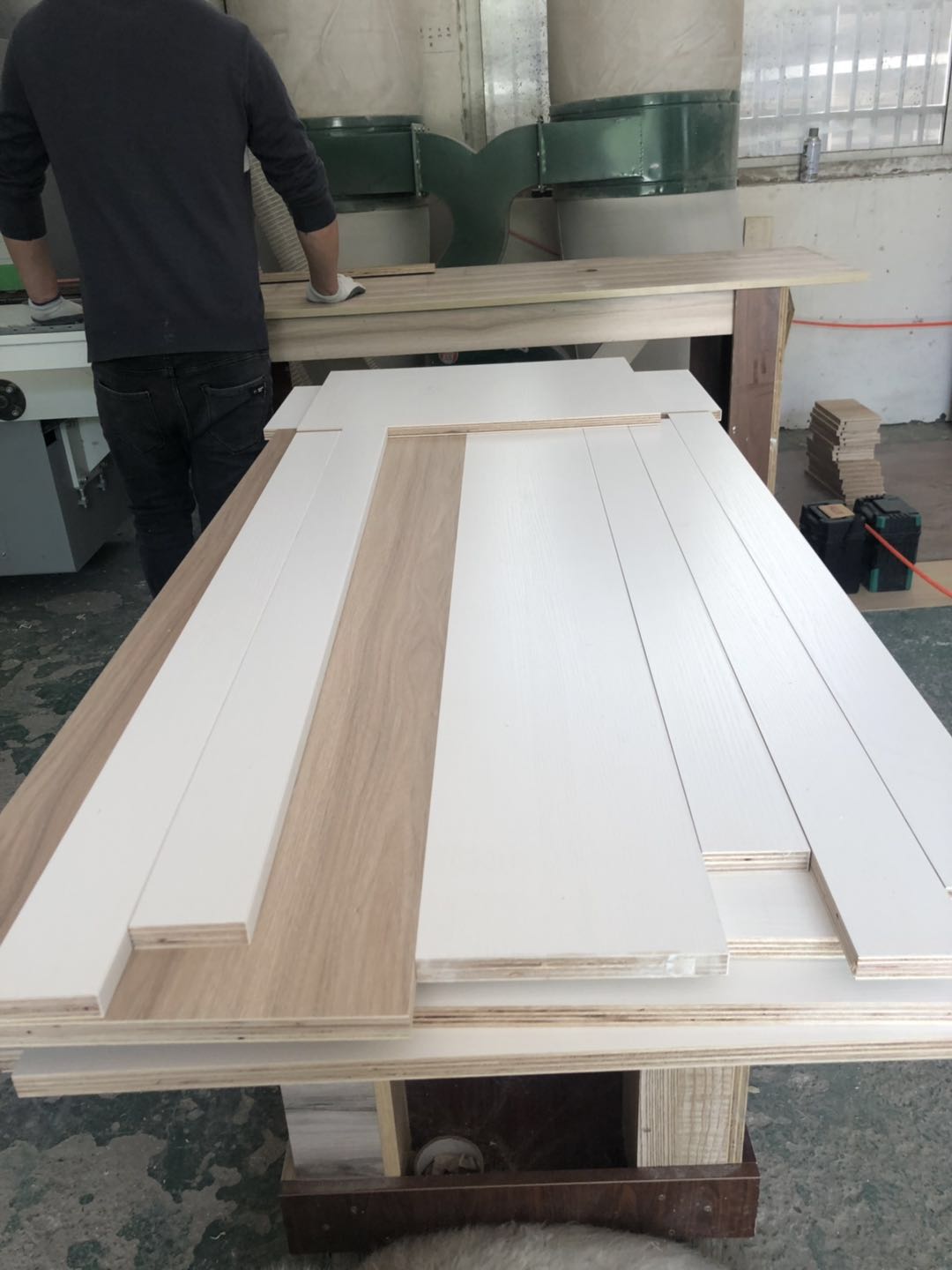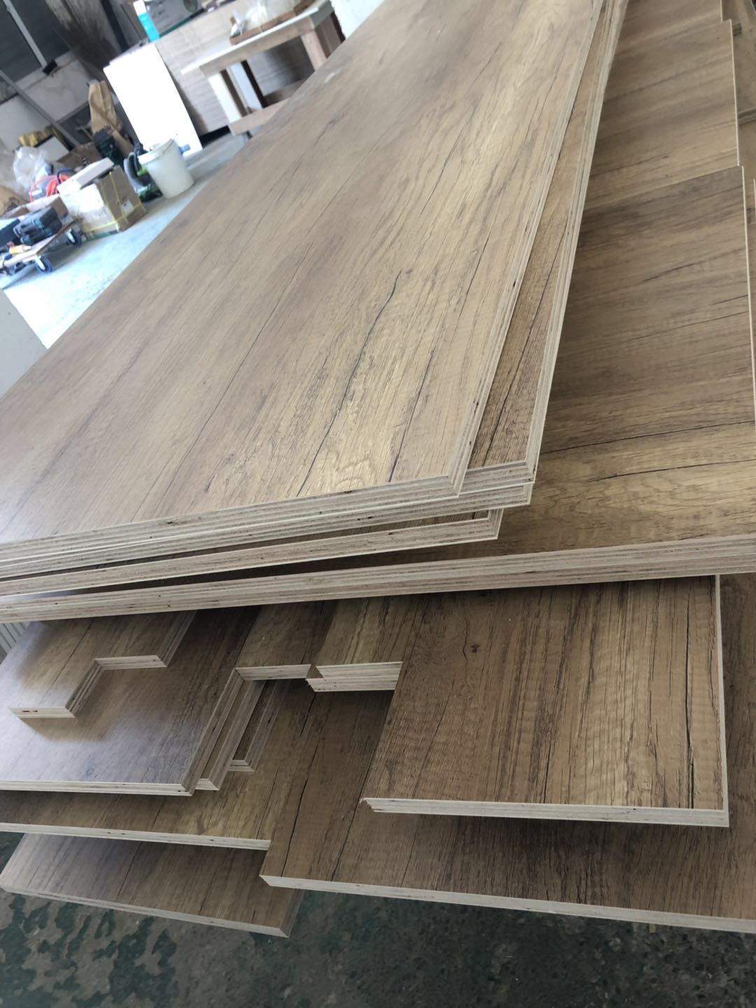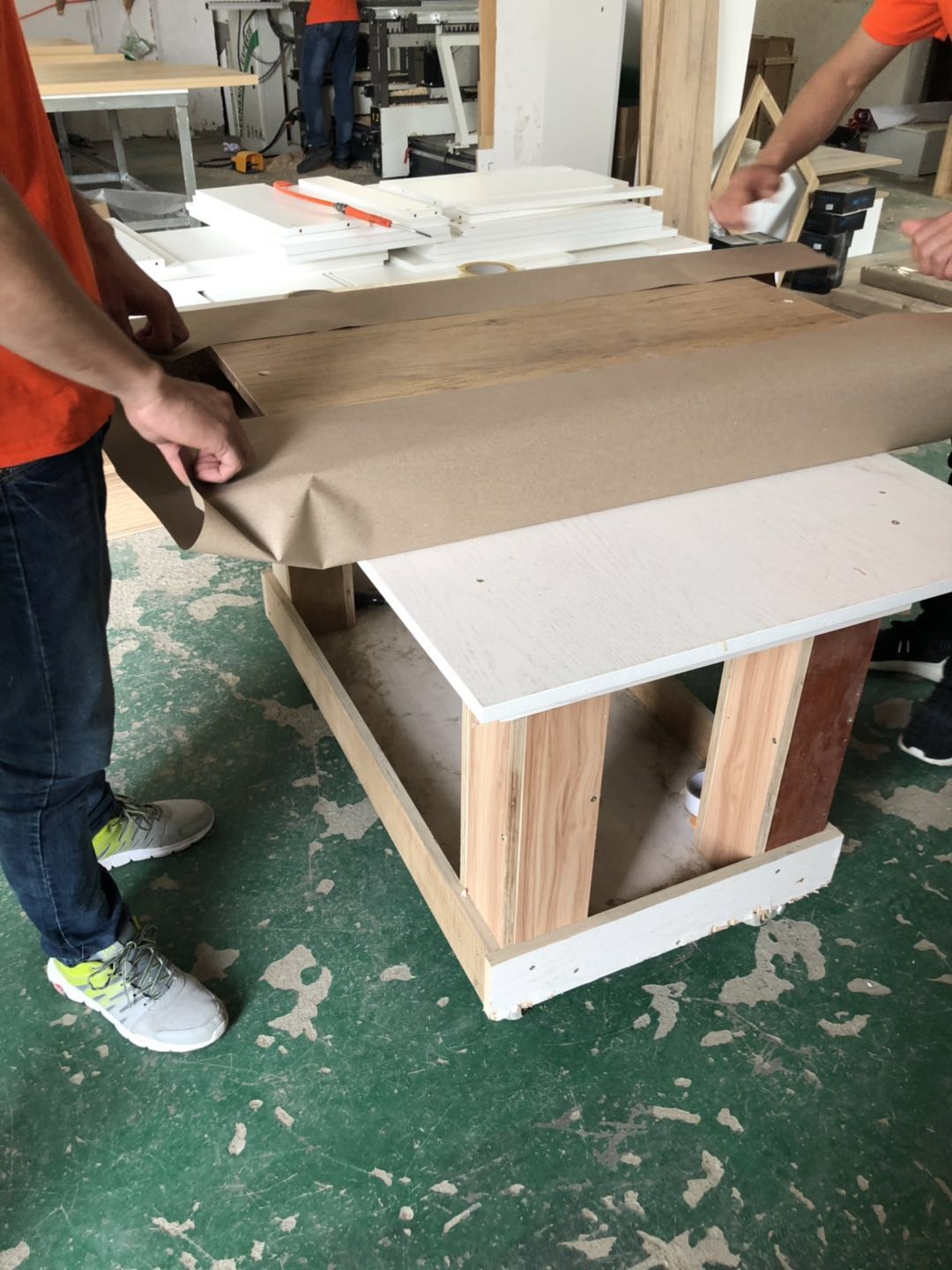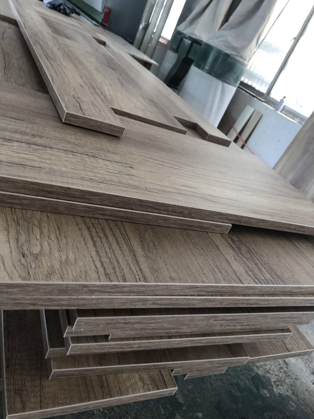開始制作啦,櫥柜,浴柜,洗衣柜裁板中,專業的設備,沒有爆邊~板材使用平安樹E0級暖白色制作,有高級的藍光防偽標識。