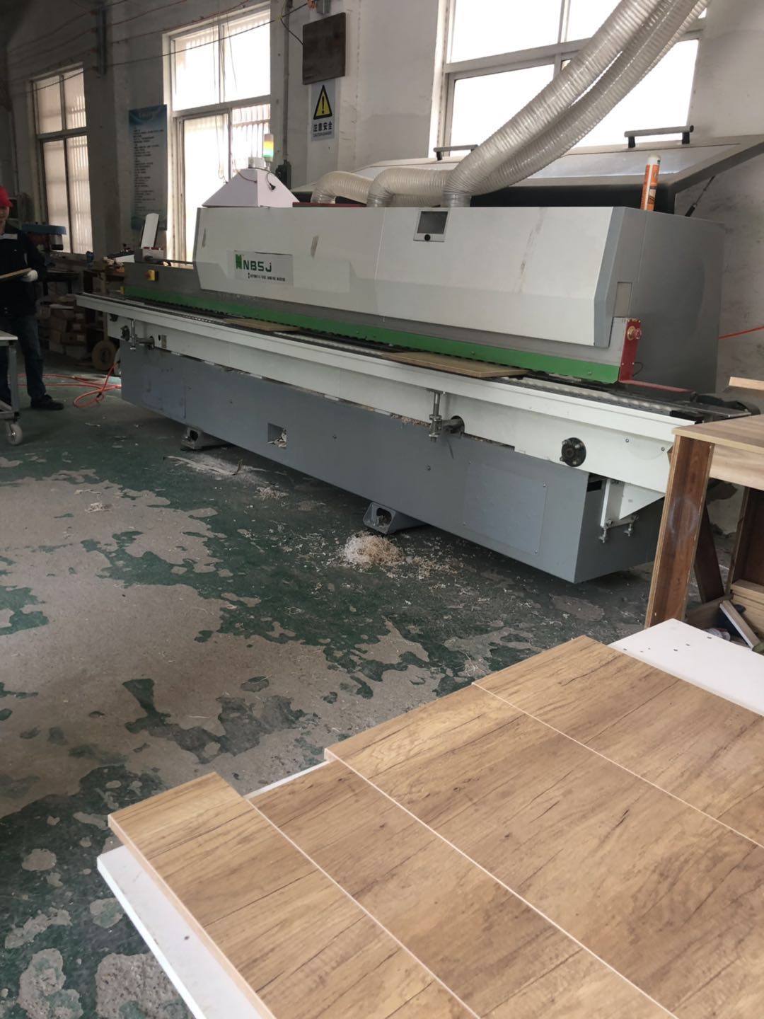 接下來封邊,使用法國波士熱熔顆粒較,設備封邊溫度達到200°C,封邊條上有小二家居的Logo哦,齒輪傳送帶可調節,方便運輸大小不同的板材。