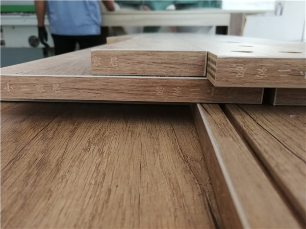 封邊同步進行中,很速度哦。封邊采用法國波士熱熔顆粒膠,設(shè)備溫度達到190-200°C封出來的邊牢固,沒有爆邊,完美無瑕。每塊板上都貼有小標簽,方便后期安裝師傅安裝,封邊條上都帶有小二家居logo的哦!方便后期售后。
