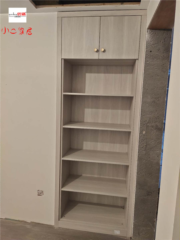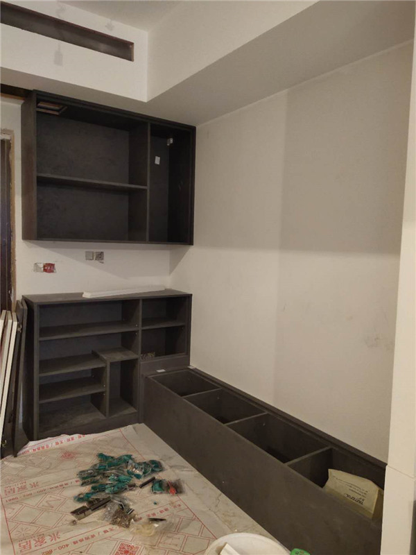 柜體基本拼裝完畢了,鞋柜卡座采用深色柜體,大氣上檔次,其他柜子采用淺色系,