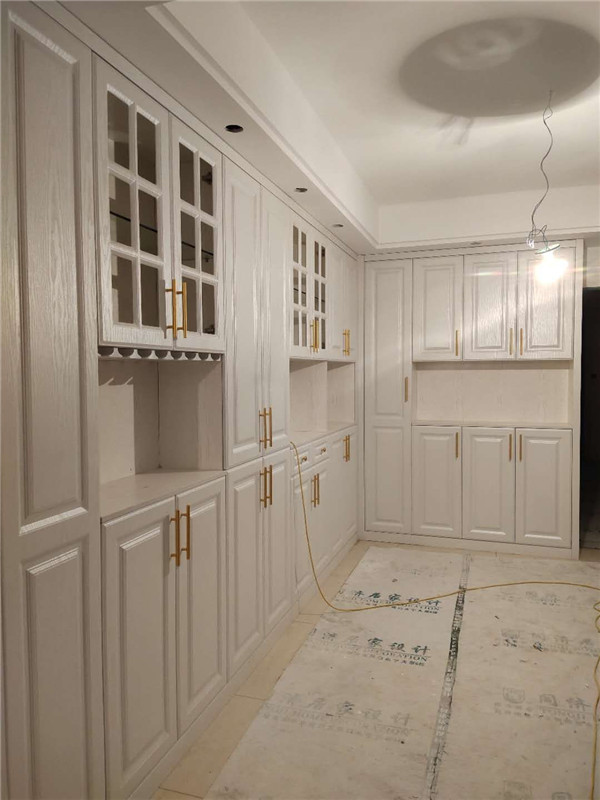 柜子安裝完畢,業主家客餐廳房間柜門采用的模壓門,廚房選擇的實木包覆門,色彩統一,顯得不雜亂,