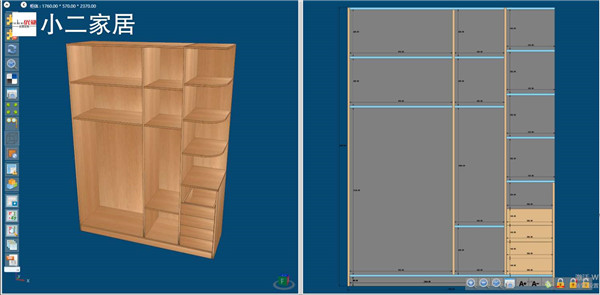 衣柜旁邊設(shè)計(jì)了開放式圓弧層板為整個(gè)衣柜增加了活波氣息,不顯得那么呆板,可以放包包,可愛的小擺件。防塵角活動(dòng)孔塞也都安排上了,