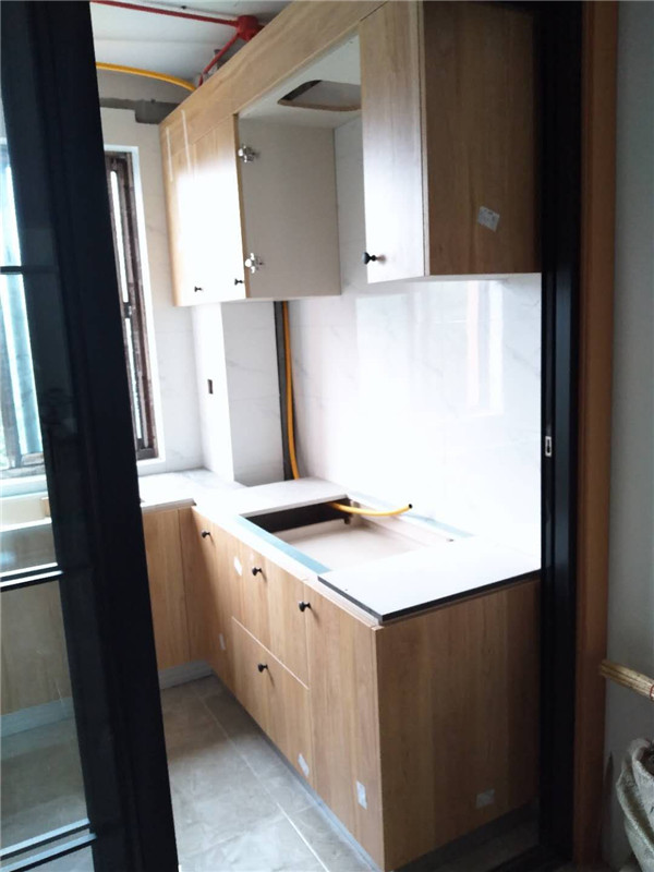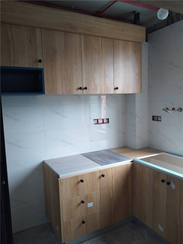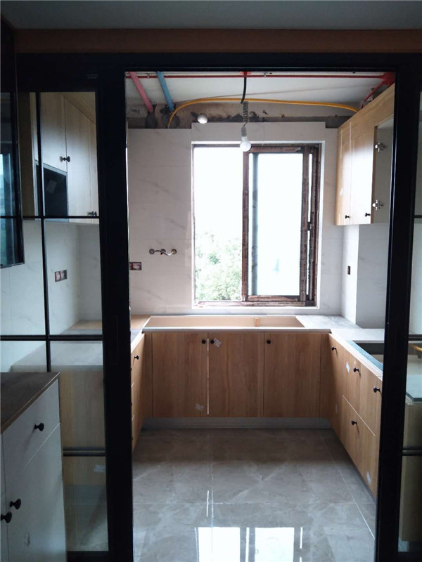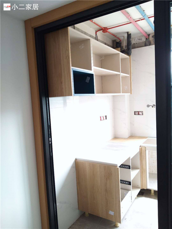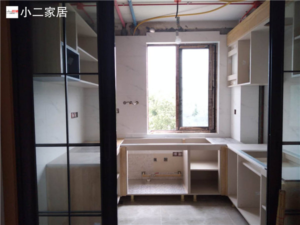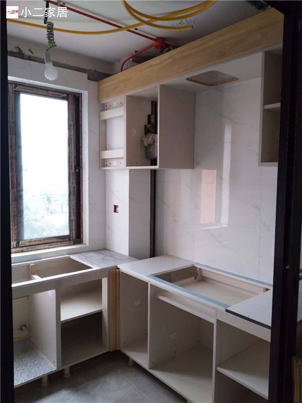 柜子基本拼裝好固定起來(lái)了,鞋柜連著卡座,既美觀又實(shí)用。業(yè)主家廚房采光挺好的,