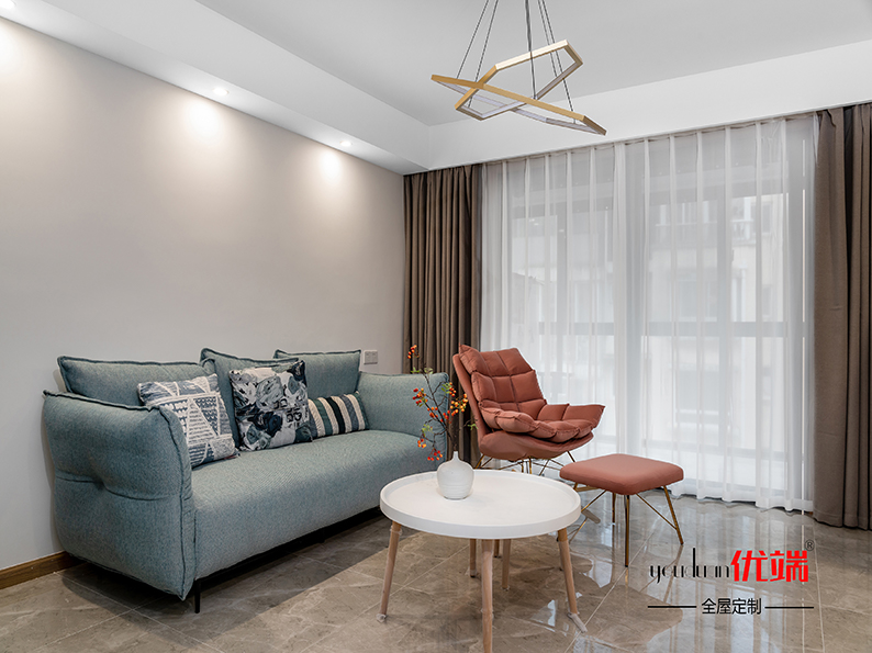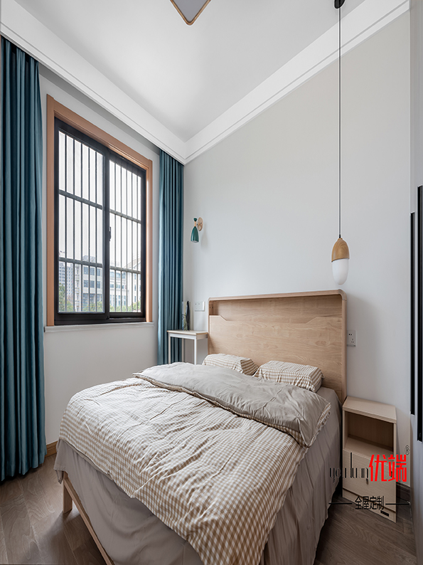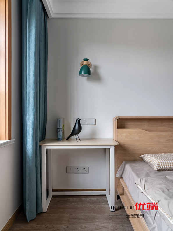 吊柜設(shè)計(jì)了一個(gè)藍(lán)色套盒,起到畫龍點(diǎn)睛的作用。衣柜柜體掛衣區(qū)折疊區(qū)劃分清晰,儲(chǔ)存空間足足的。