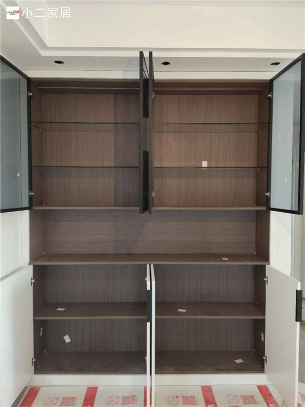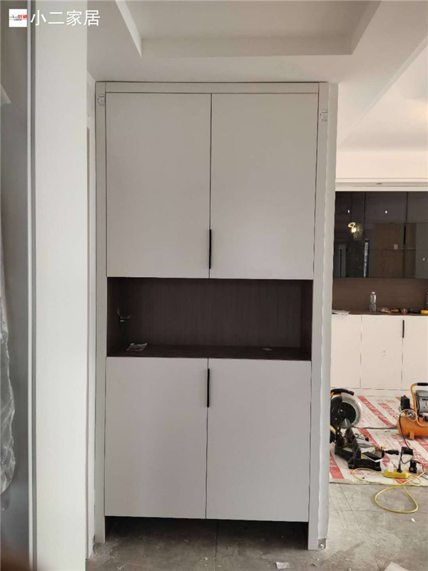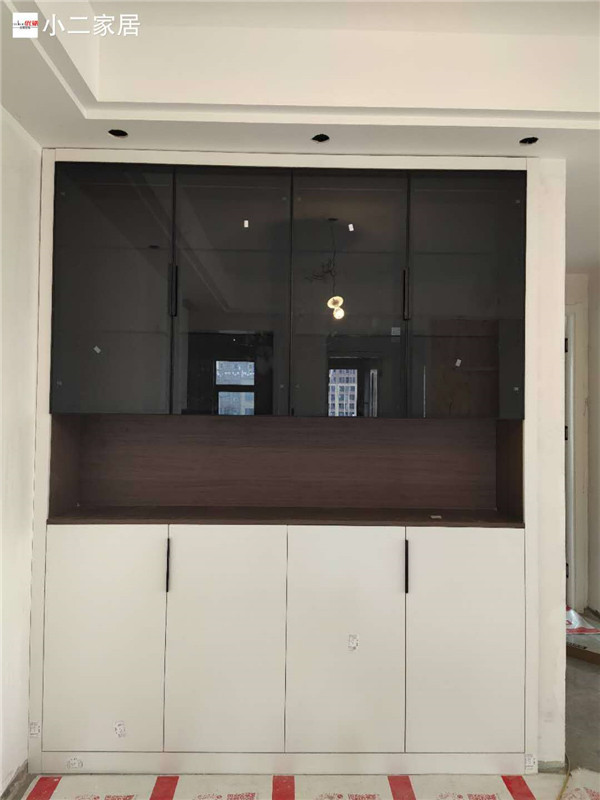 深色柜體白色門板可謂是金典搭配,相互襯托,給人一種結(jié)實(shí)穩(wěn)重的氣質(zhì)感。酒柜上搭配灰波門,又多了一絲高級(jí)感。